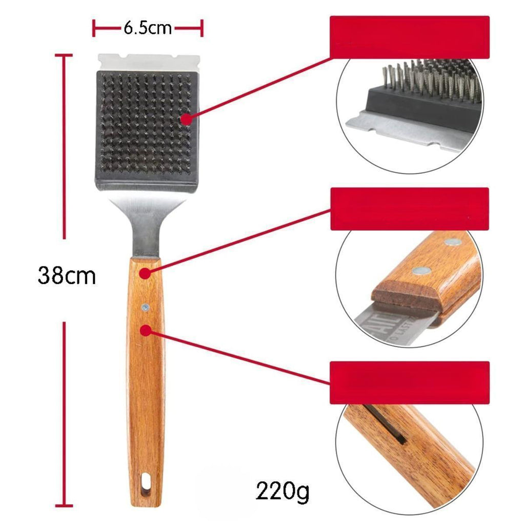【Material】: This BBQ Grill Brush is made of stainless steel and copper, which is high temperature resistant, and wear resistant for long term use. The handle is crafted from wood for a comfortable grip and durability.