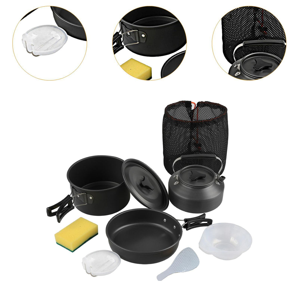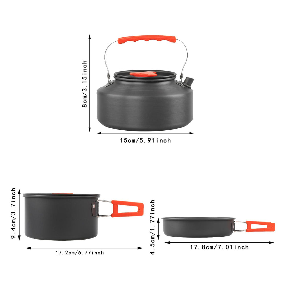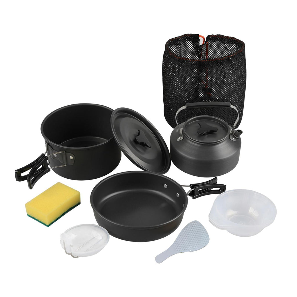 【Comprehensive Camping Cookware Set】: This Camping cookware set is suitable for 2-3 people and includes a pot, frying pan, kettle, three bowls, a soup spoon, a spatula, a cleaning sponge and a mesh bag. It meets all your cooking needs while camping
