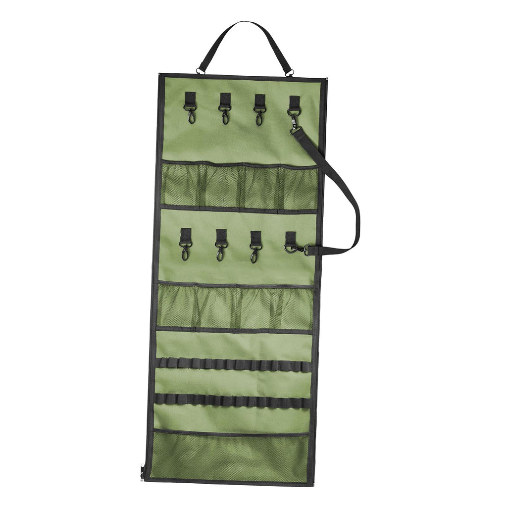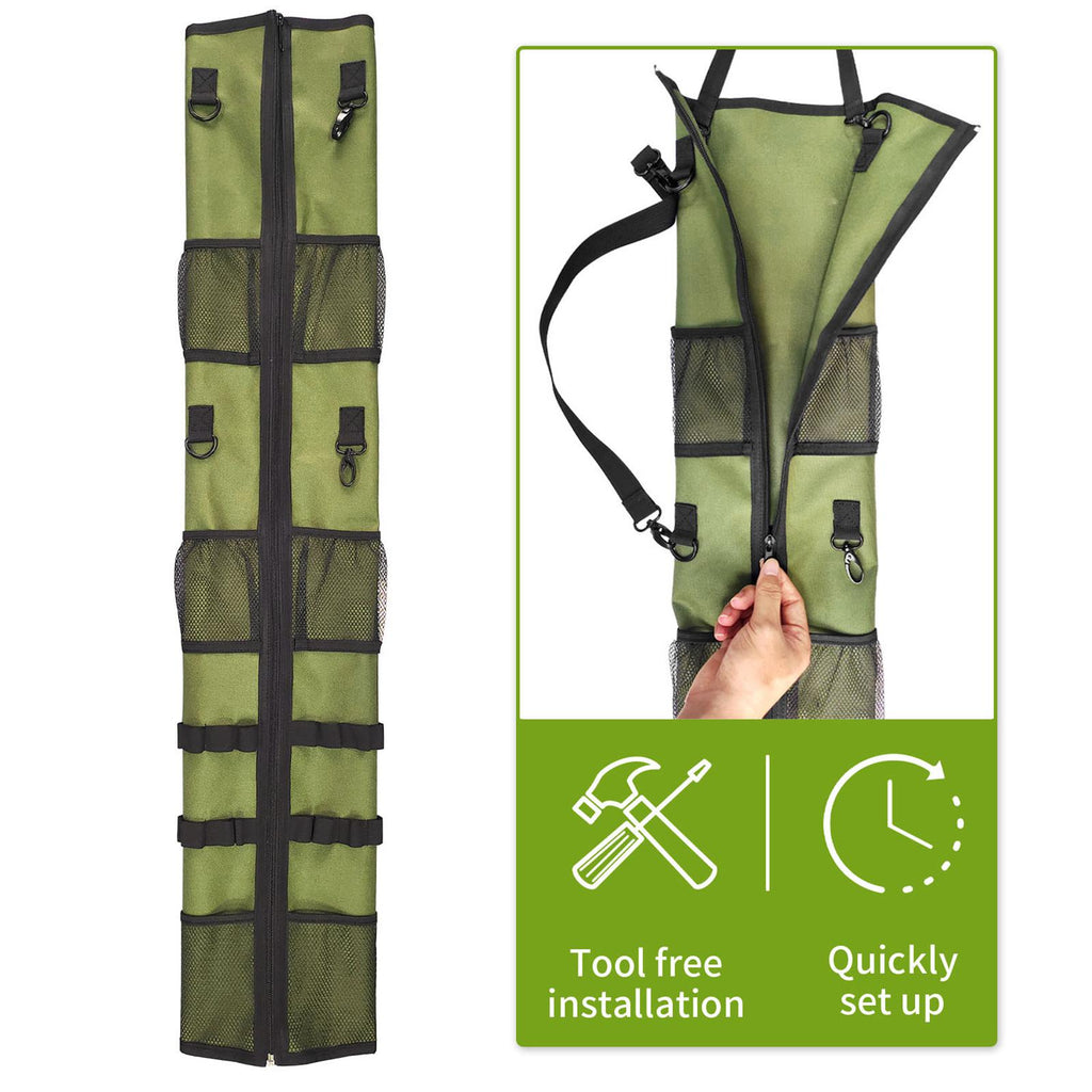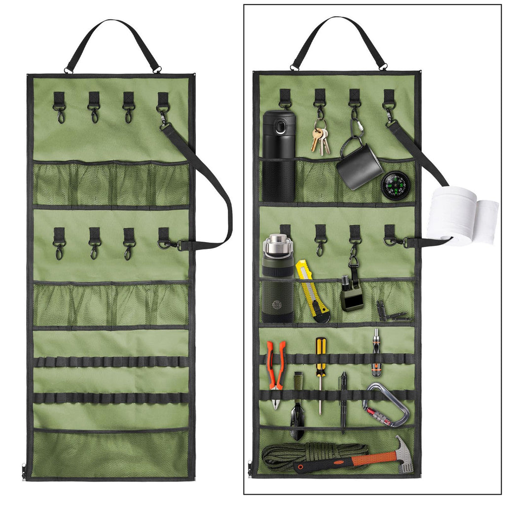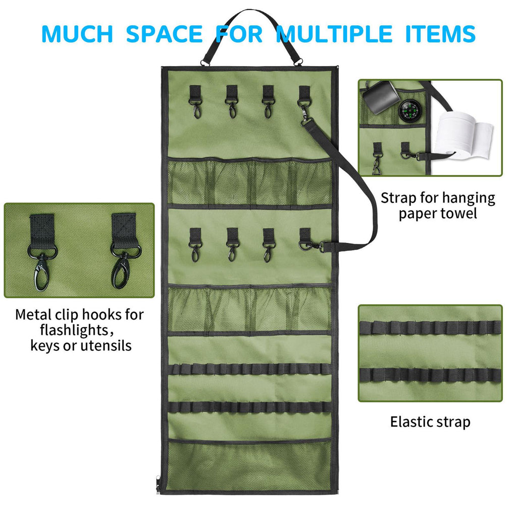 【Quality Material】: The Hanging Storage Canopy Organizer is made from durable 600D Oxford fabric. Hooks are made of metal, This allows you to easily hang your camping gear.