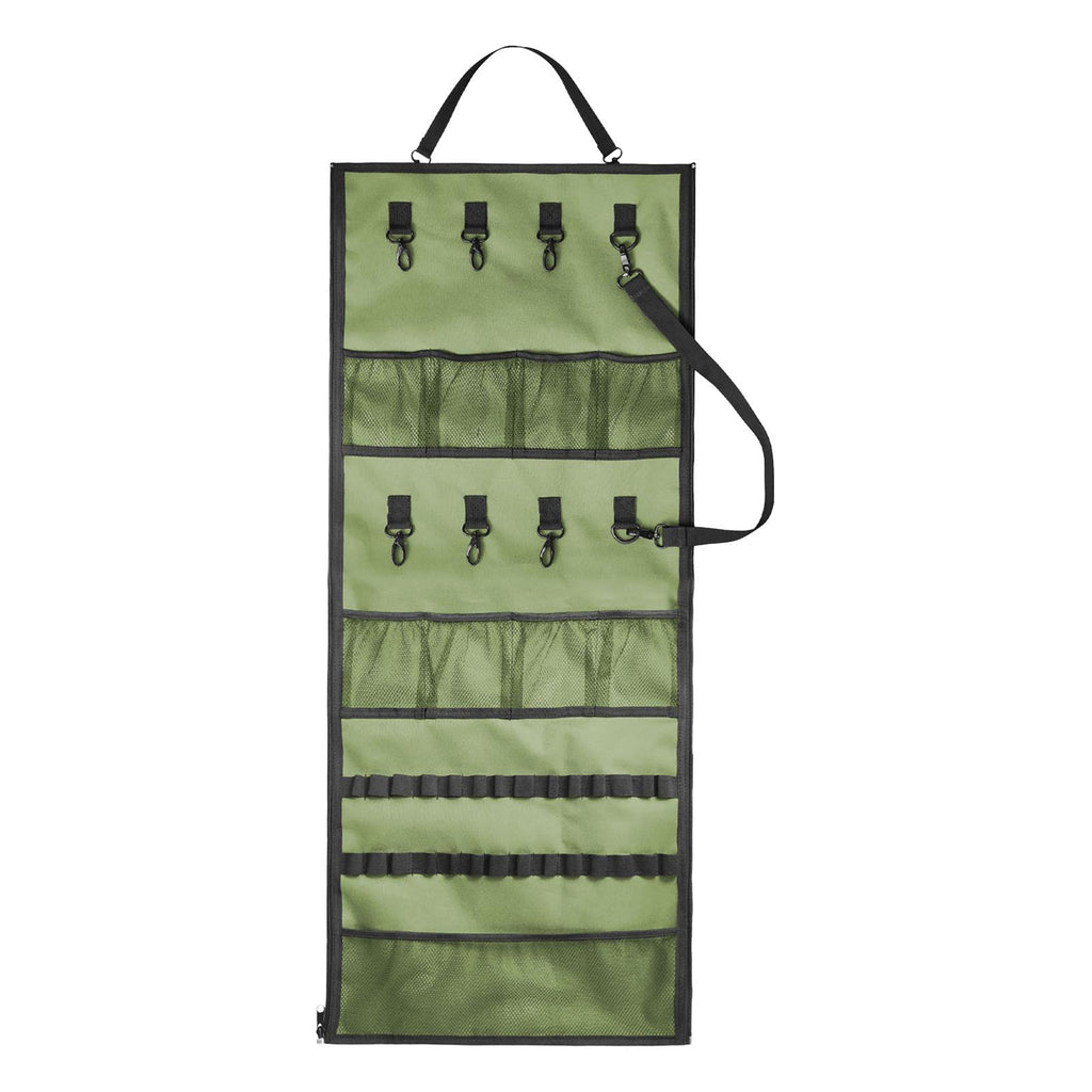 【Storage】: This storage bag includes 8 hooks for hanging items such as fans, umbrellas, baseball caps and more. It also features 8 small mesh pockets for storing items like cell phones, sunglasses, watches etc., and large mesh pocket for storing children's toys and snacks; with an additional 28 sections for hanging glasses etc. Additionally, it comes with a strap for hanging paper towels.