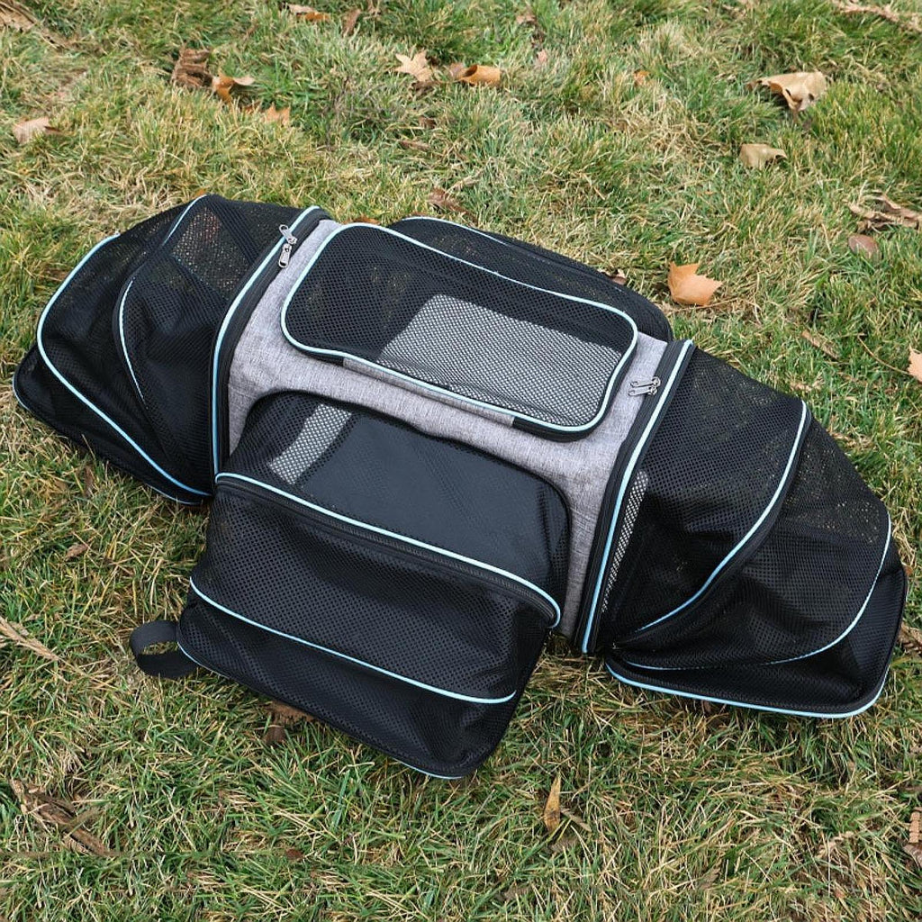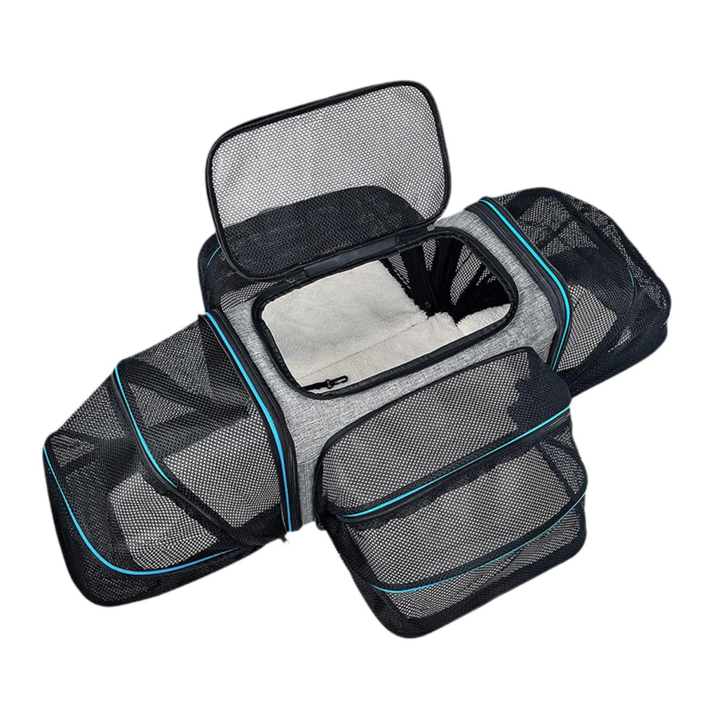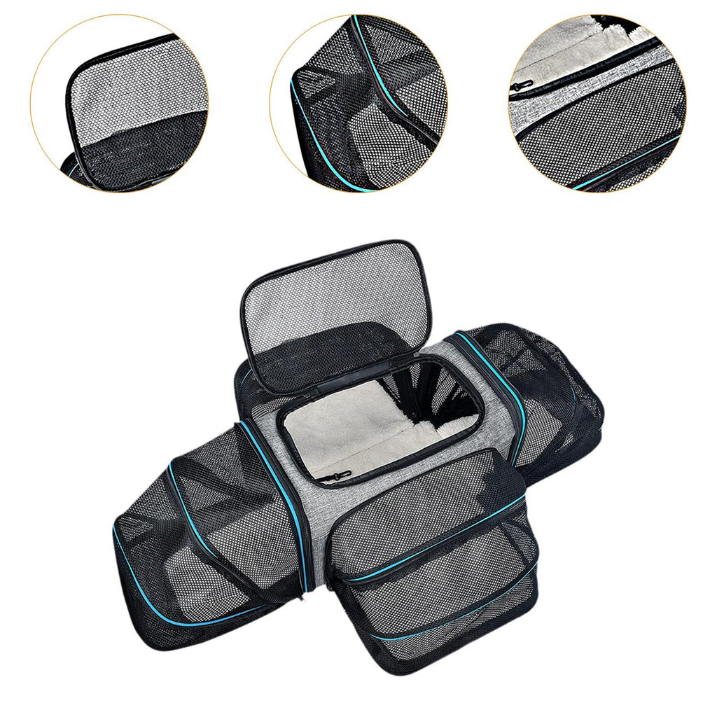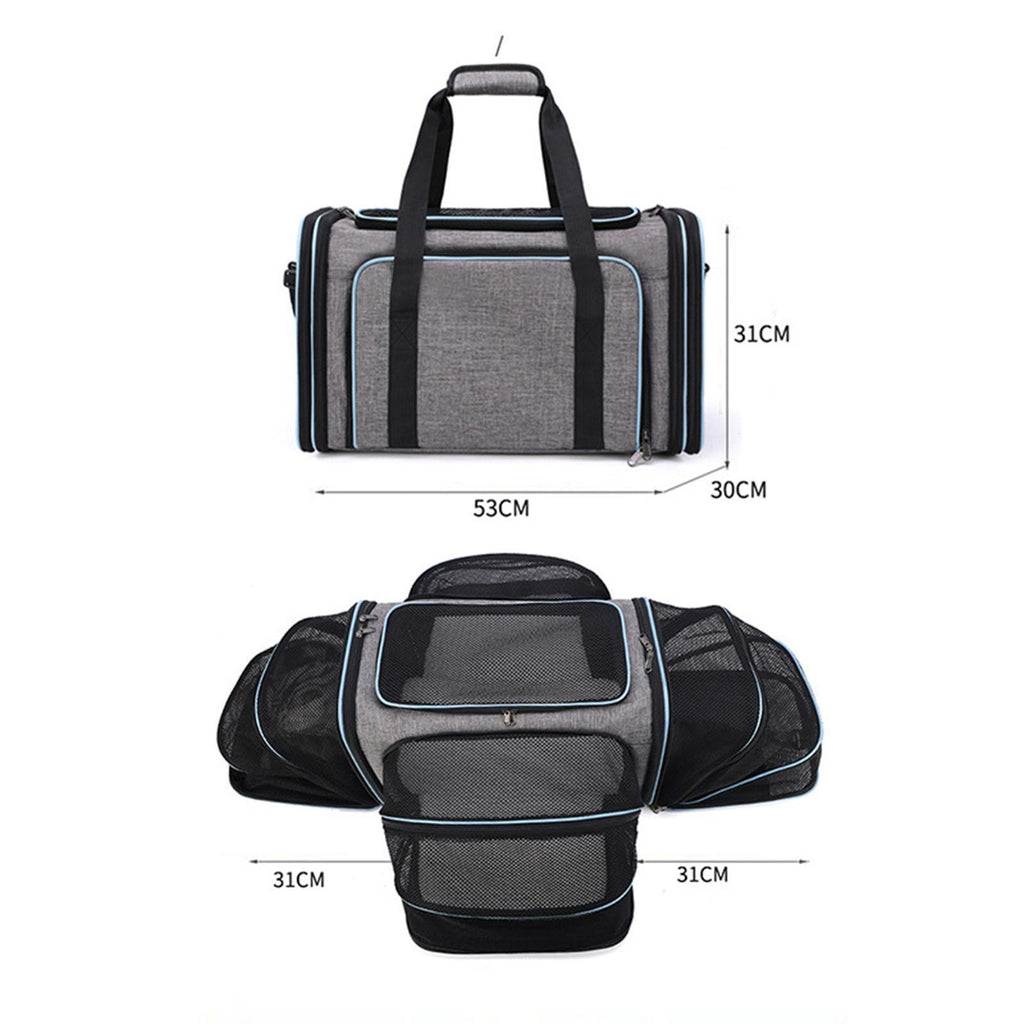 [Foldable]: This pet bag is foldable, easy to carry and store; it can expand to 4 sides to give your pet room to lie down or move; the pet bag has storage pockets on the side to store treats or pet toys, etc.