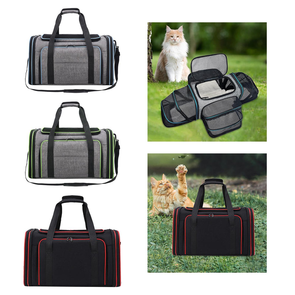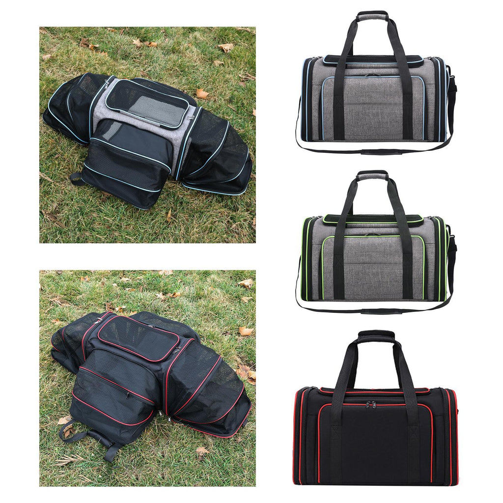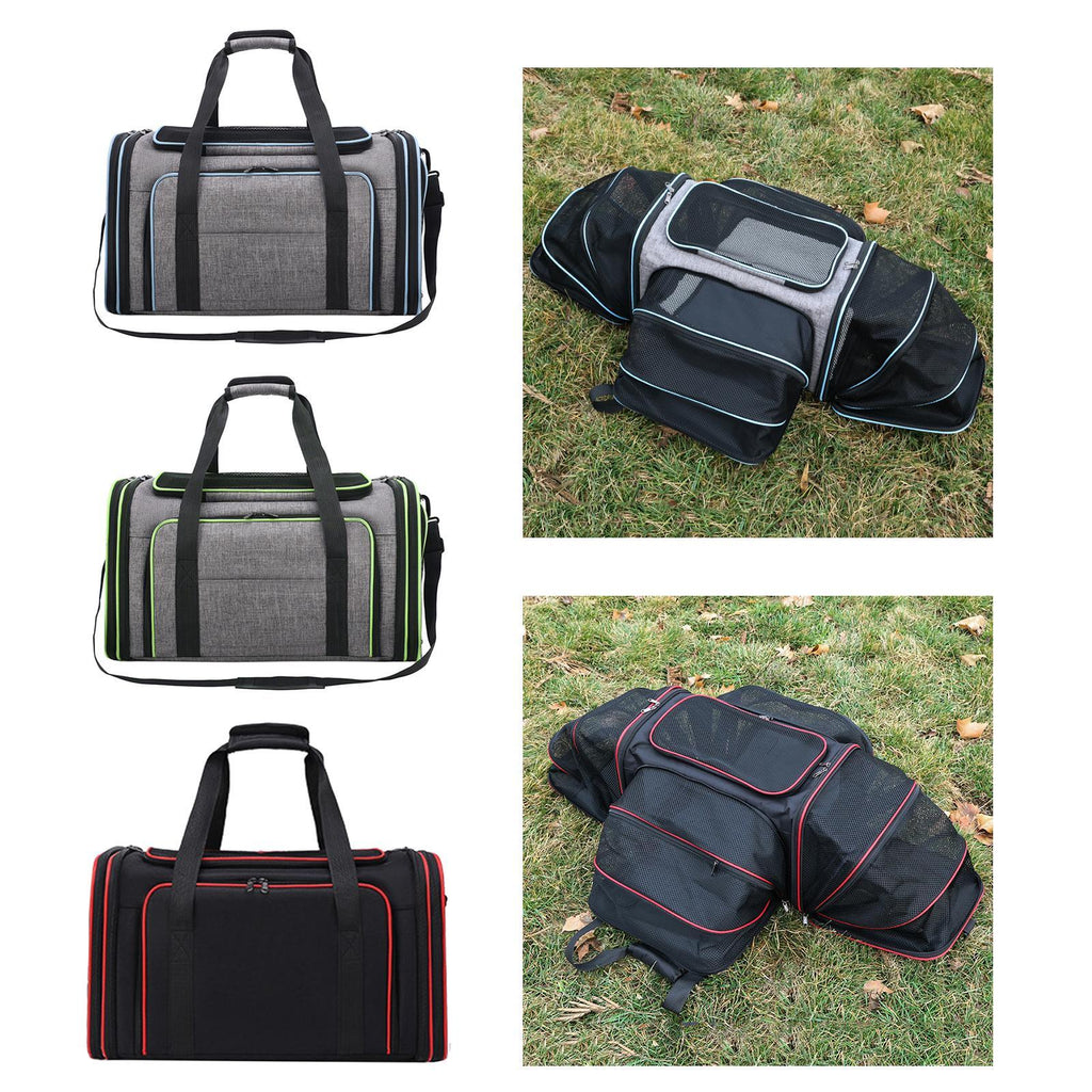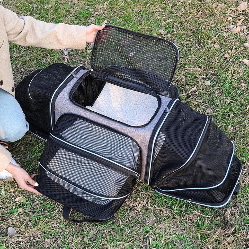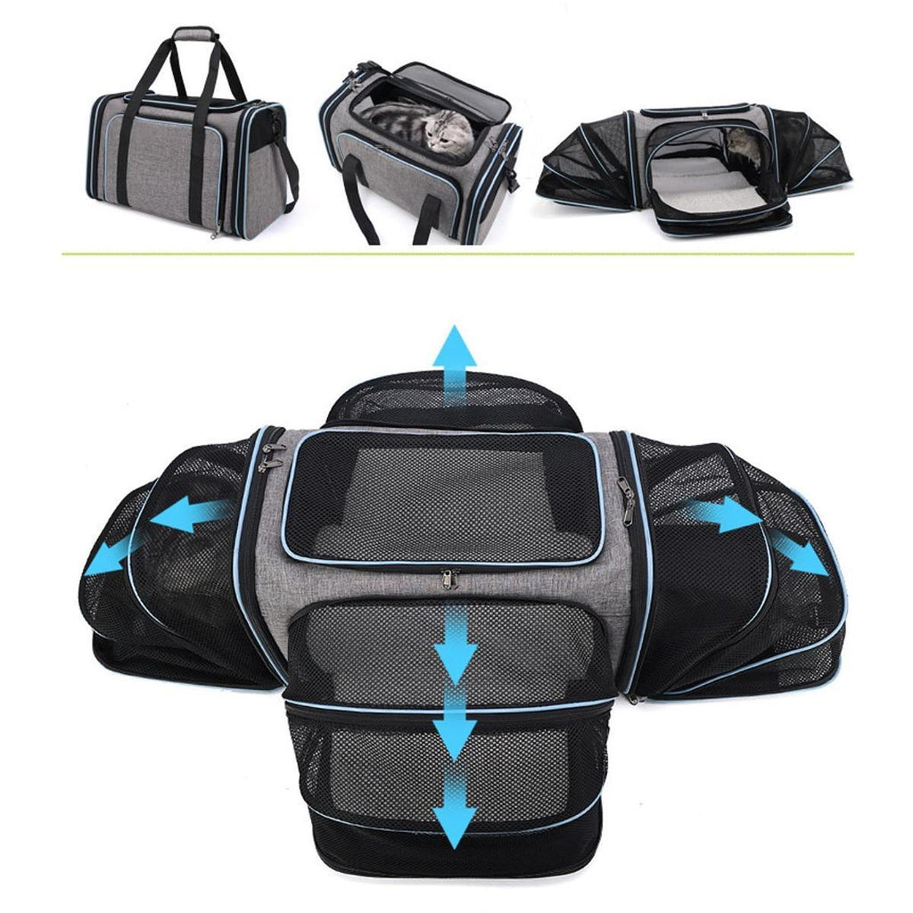 [Foldable]: This pet bag is foldable, easy to carry and store; it can expand to 4 sides to give your pet room to lie down or move; the pet bag has storage pockets on the side to store treats or pet toys, etc.