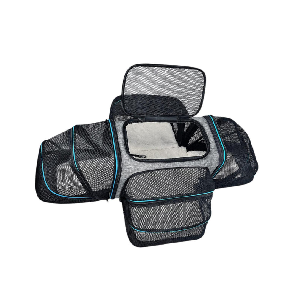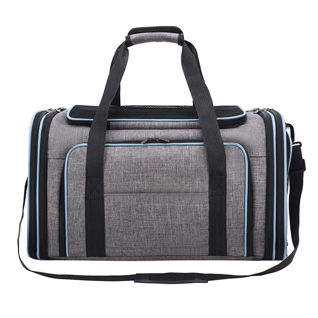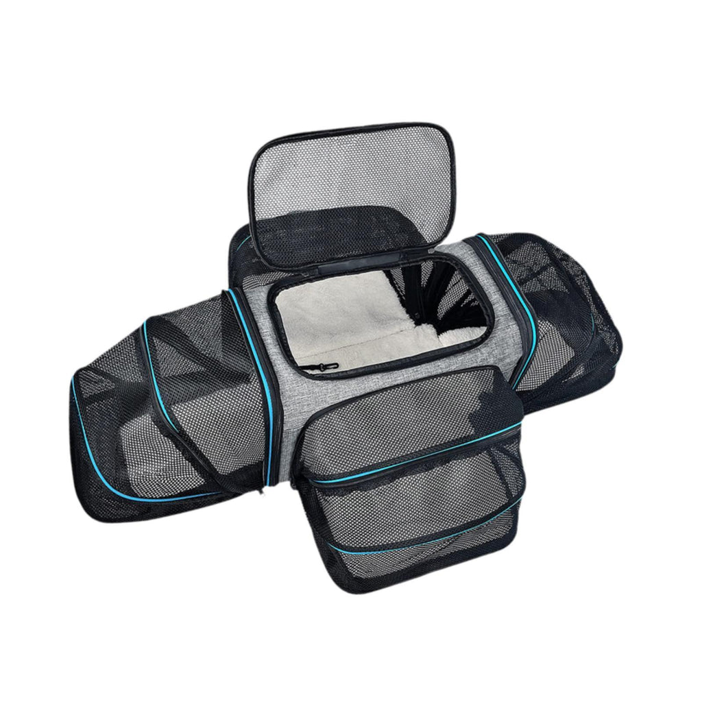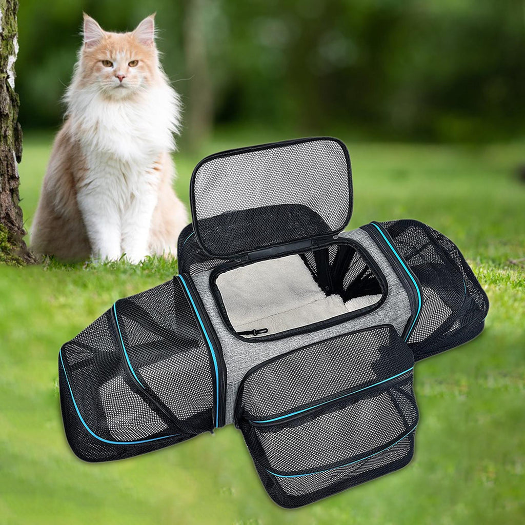 [Foldable]: This pet bag is foldable, easy to carry and store; it can expand to 4 sides to give your pet room to lie down or move; the pet bag has storage pockets on the side to store treats or pet toys, etc.