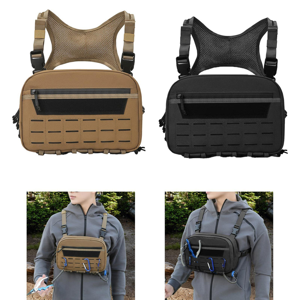 【Convenient Bottom Strap Design】: Equipped with a bottom strap, this chest rig vest allows you to securely attach items such as an empty fish holder or other accessories, adding to its functionality for various outdoor activities