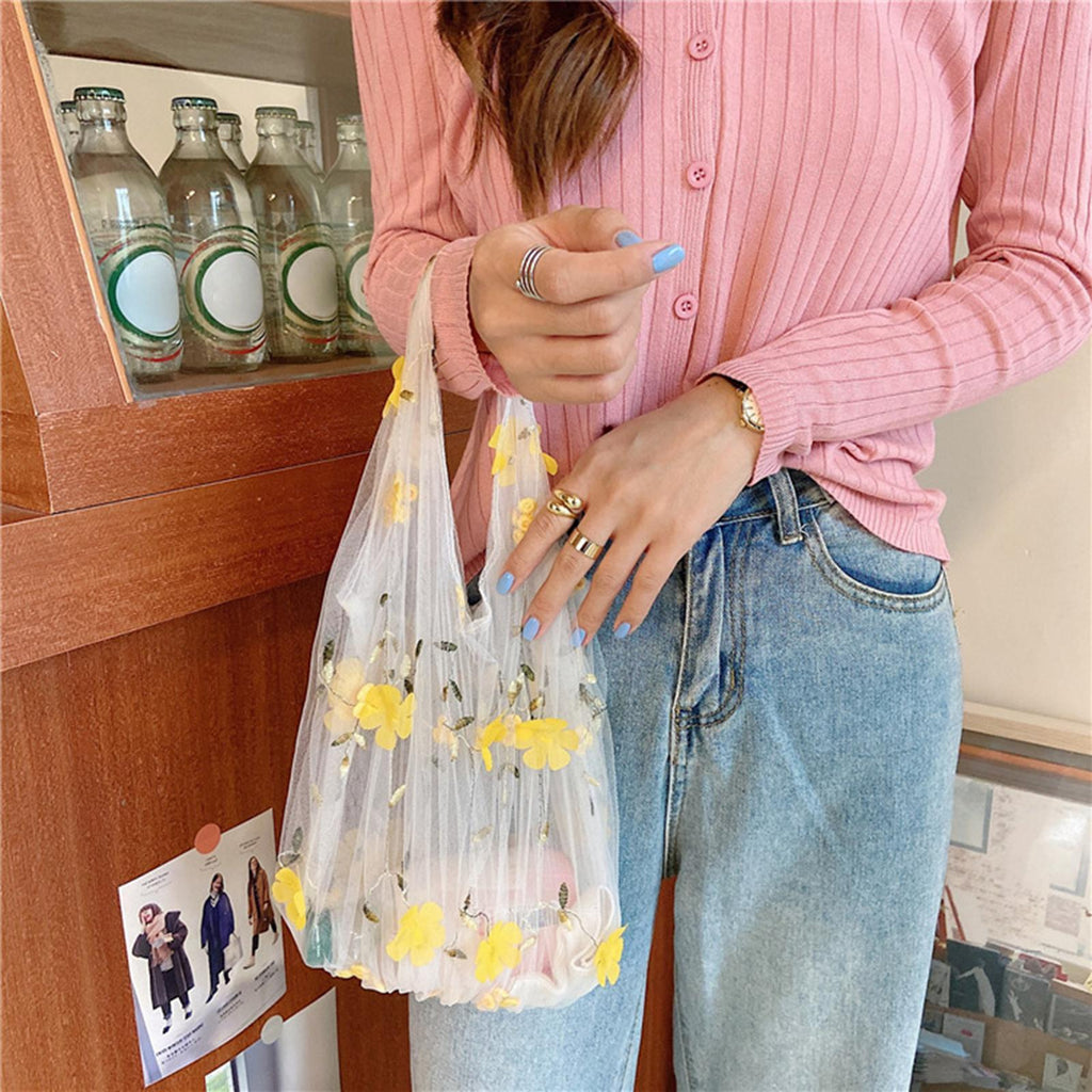 【Elegant Design】: This stunning Transparent Mesh Handbag features a flower embroidery design, which looks charming and brings a sense of elegance