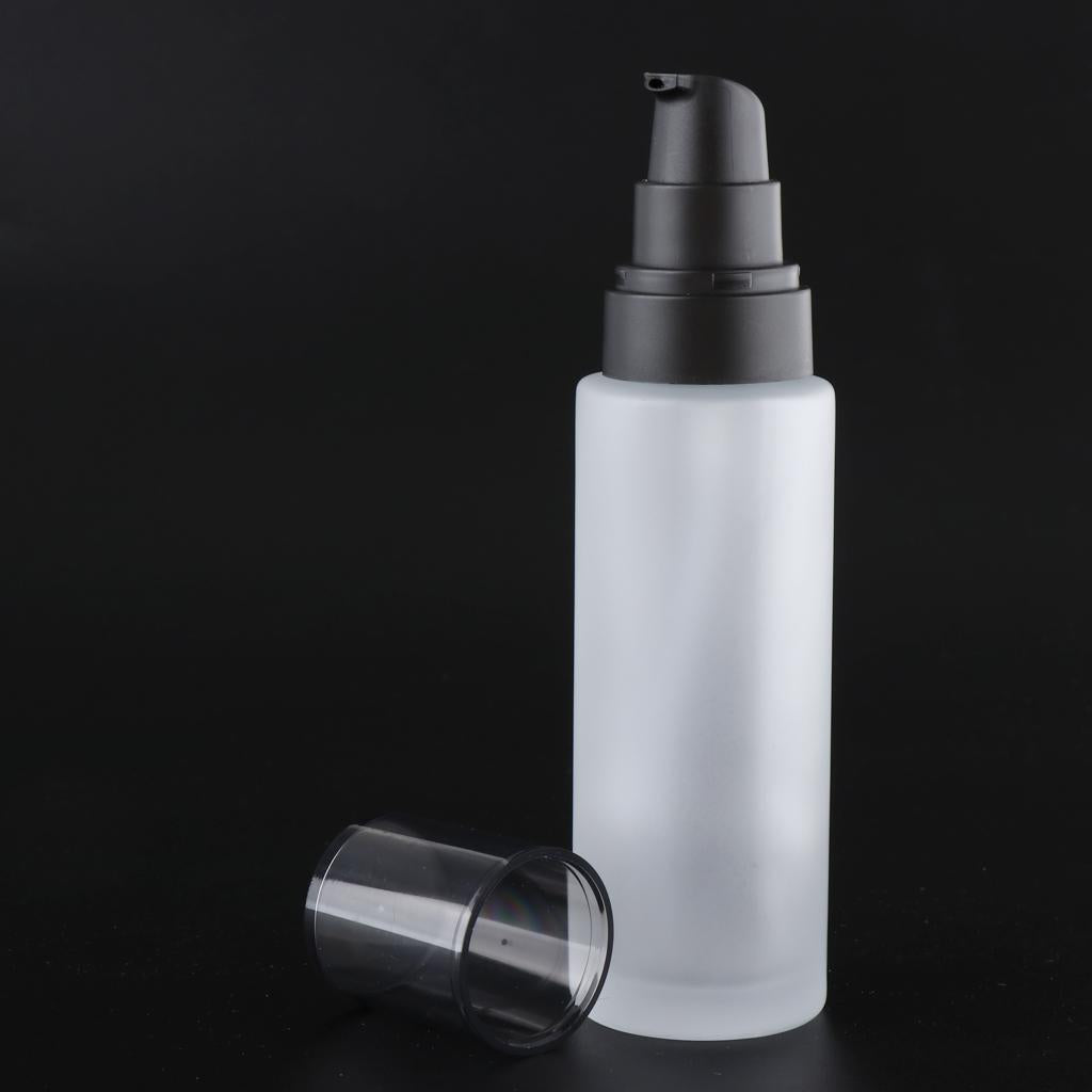 Sturdy thick frosted glass with plastic pump and lid, durable and reusable.