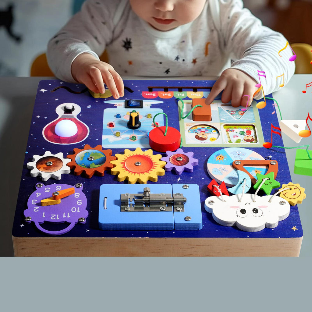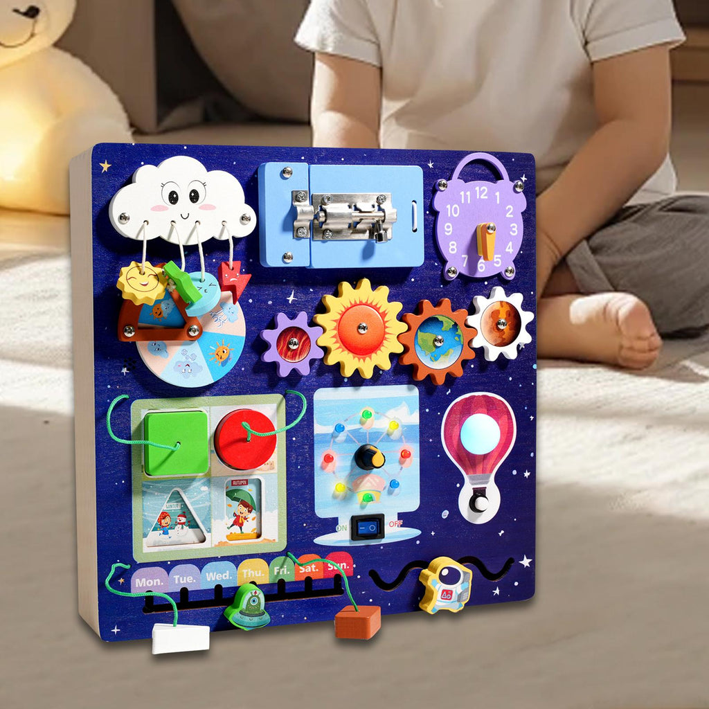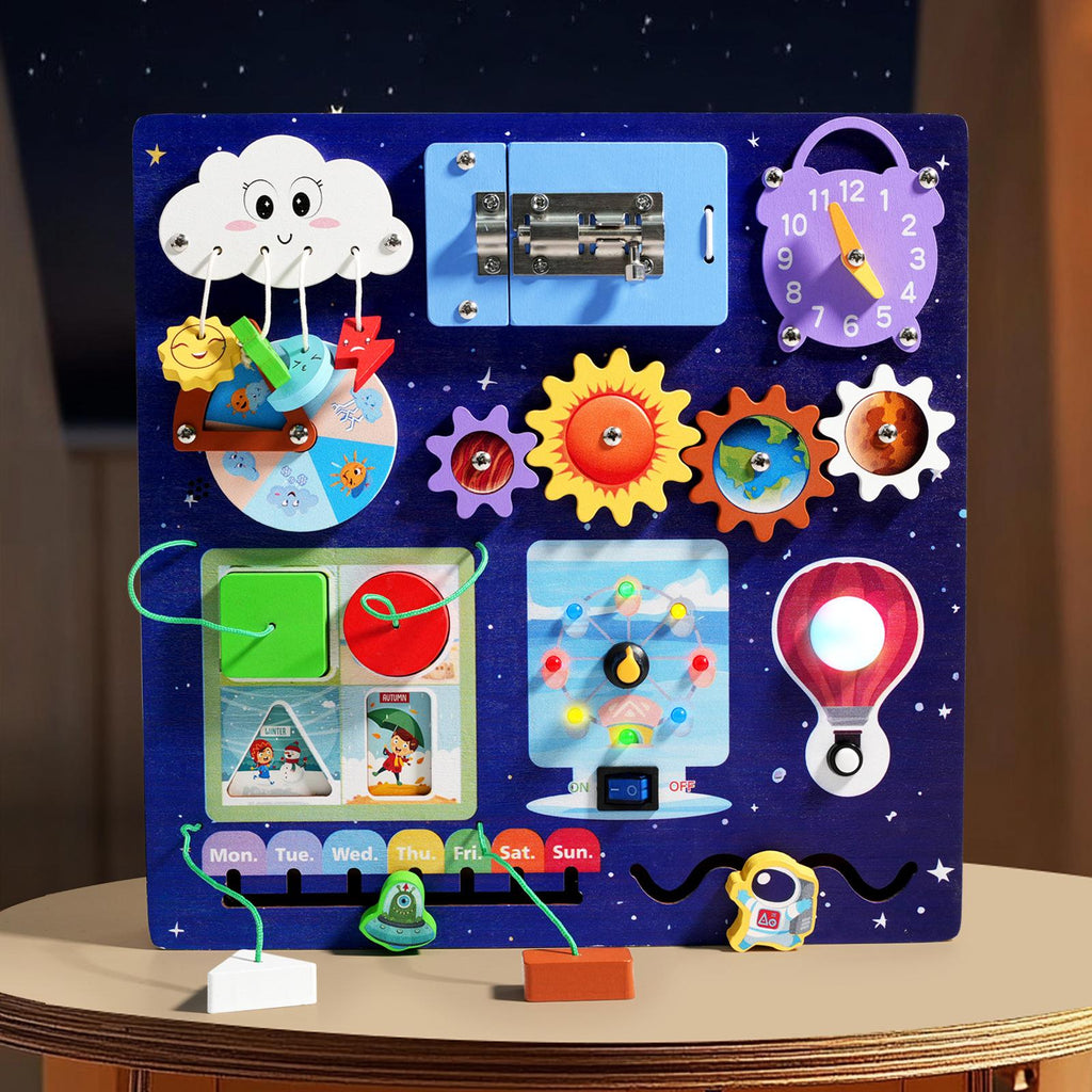 【Interstellar Exploration Enlightenment Board】: Weather Wheel, 6 types of weather changes; Rotating lights, Adjustable lighting speed; Button Light, 7 colors alternating; 4 Seasons Recognition, Voice Broadcast; Rope Pulling Game; Digital Clock, Pointer can be rotated; Gear Game: Linked Gears