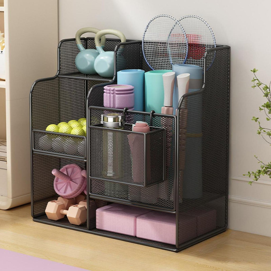 【Versatile Home Gym Storage Solution】: This multifunctional storage rack is great for organizing a variety of fitness equipment, including mats, blocks, foam rollers, kettlebells, dumbbells, resistance bands, jump ropes, and more. It's an ideal accessory for enthusiasts and fitness lovers alike