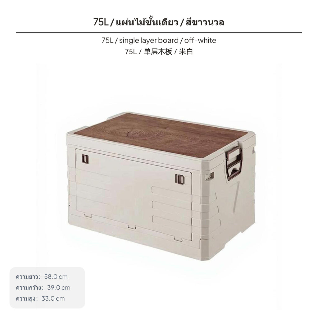 [Foldable and Space-Saving] This innovative outdoor storage box features a foldable design, reducing to just 7cm or 10cm in height when folded, making storage and transportation easy.[adaptable Capacity choices] Available in multiple sizes (28L, 35L, 40L, 55L, 60L, 75L), this storage box meets a variety of needs, whether for camping, picnics, or trunk organization.[Convenient Multi-Functionality] Equipped with a wooden lid that doubles as a small surface for outdoor activities and a threecompartment partition for efficient organization and easy retrieval.[sturdy and Protective Materials] Made of sturdy PP and wood, the box is water- and particlesresistant, ensuring your items remain protected and spotless in outdoor settings.[Stylish and Stackable Design] Featuring elegant color choices like ivory, tan, and cream, it complements various settings while allowing for stable upright layering to maximize space usage.Specification: