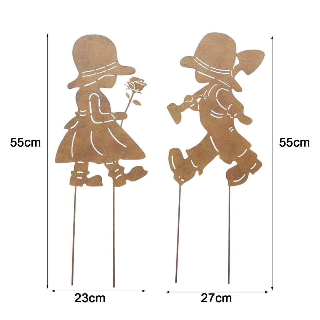 【Product List】: 2 garden Stakes. The boy Garden Stake measures 27cmx55cm, and the girl Garden Stake measures 23cmx55cm.