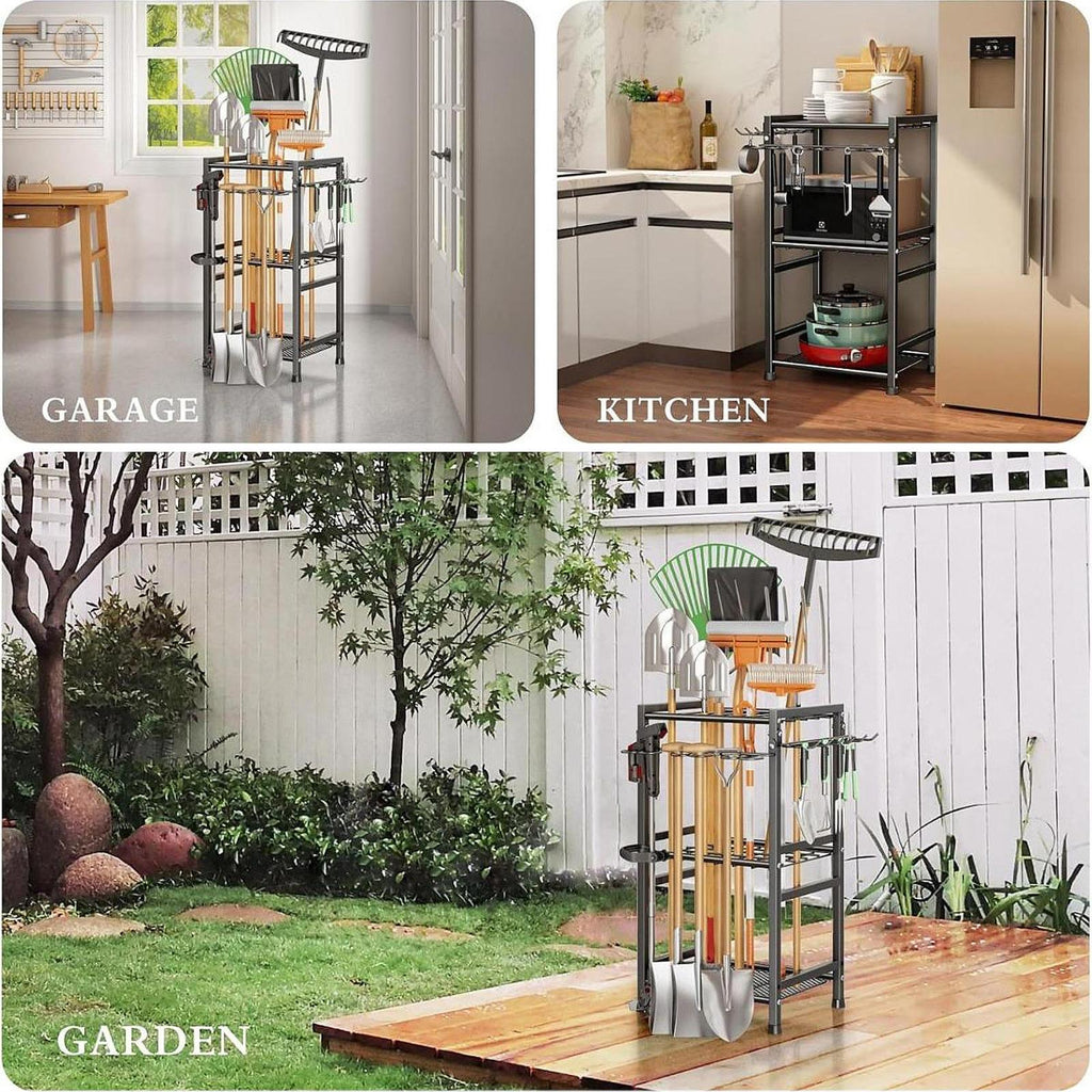 【Versatile Use】: Designed to fit effortlessly into garages, gardens, sheds, and backyards, this organizer enhances tool management with its comprehensive storage system tailored for shovels, leaf rakes, bow rakes, mops, brooms, and more