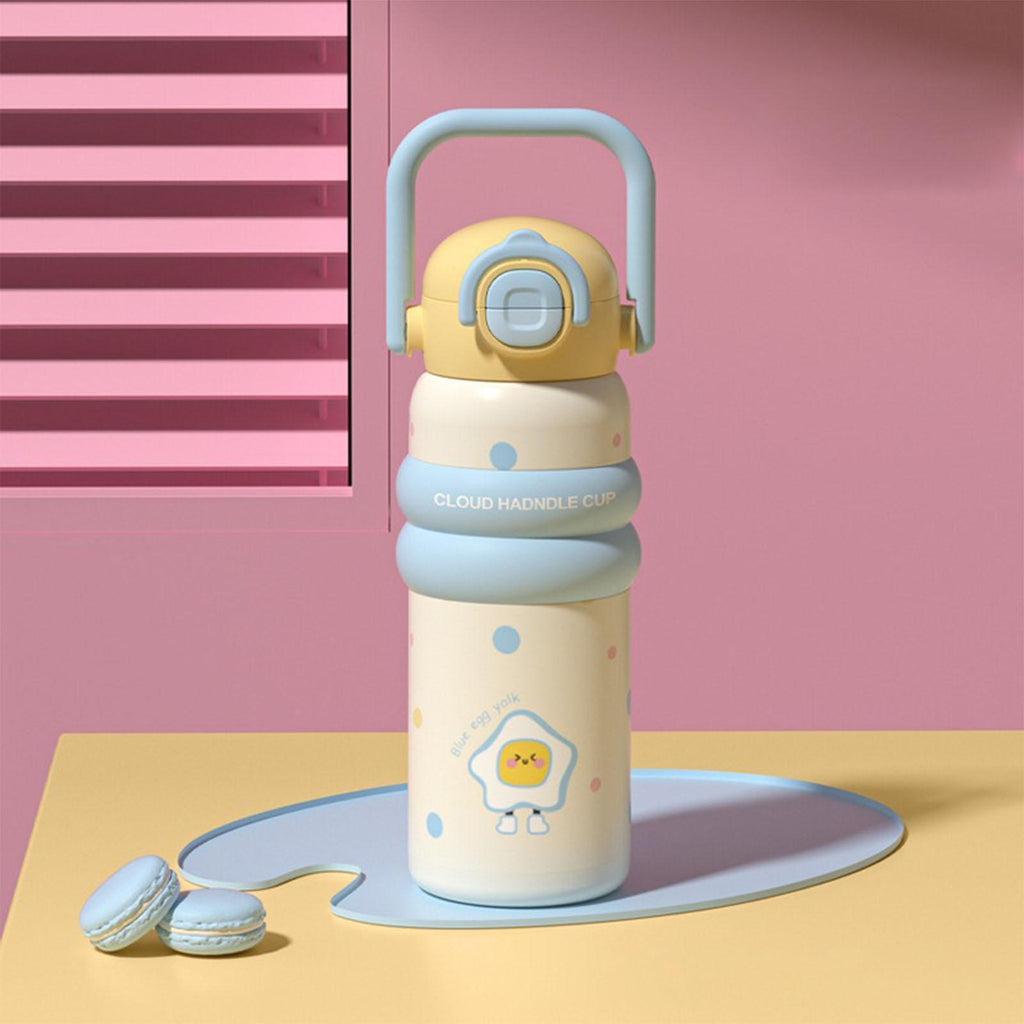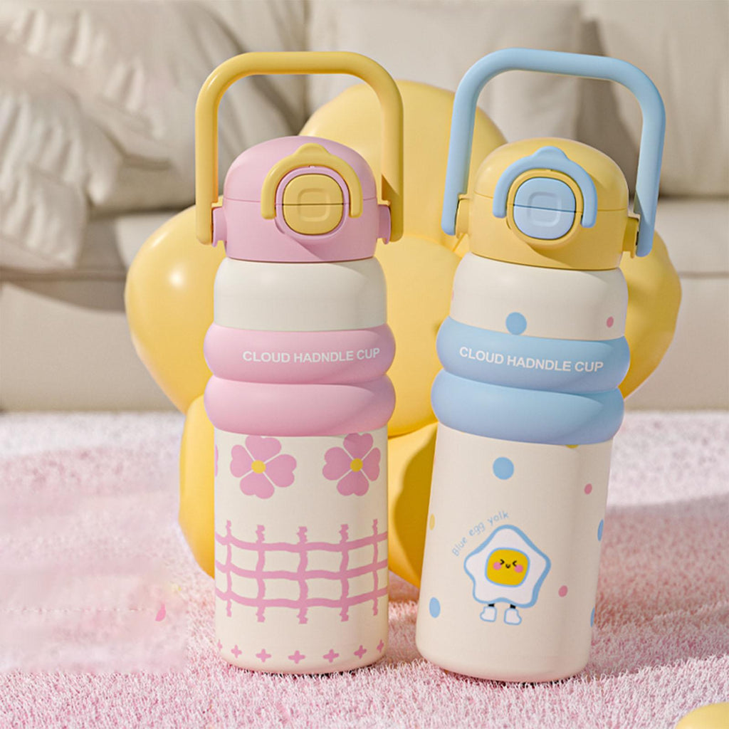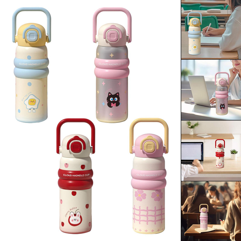 【Cute design】: This vacuum water cup adopts a fashionable and cute design, with a large capacity of 600ml and a handle, which is also convenient to carry as your fashion accessory