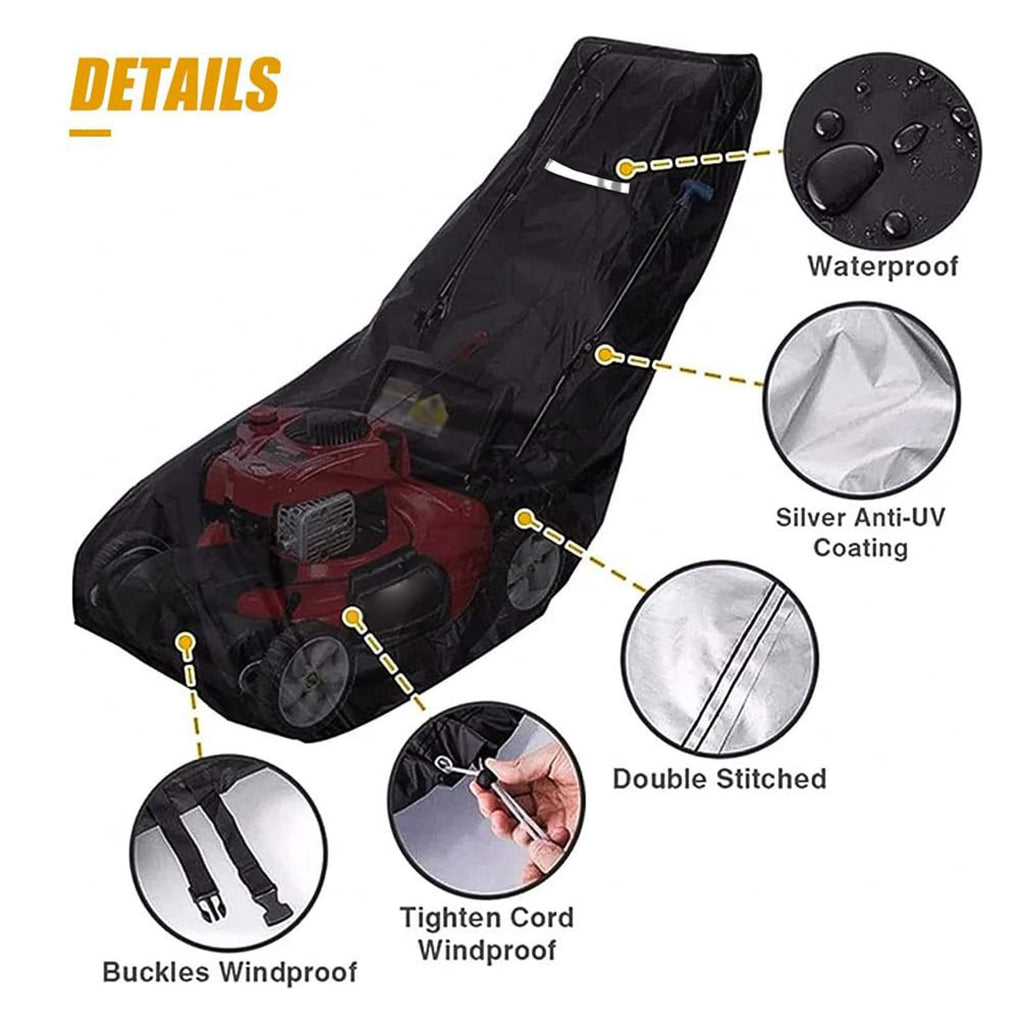 【Adjustable Fixation】The Lawn Mower Storage Bag is designed with tighten cord and buckles, which can be adjusted and fixed, and is windproof, waterproof, sunproof, and dustproof.