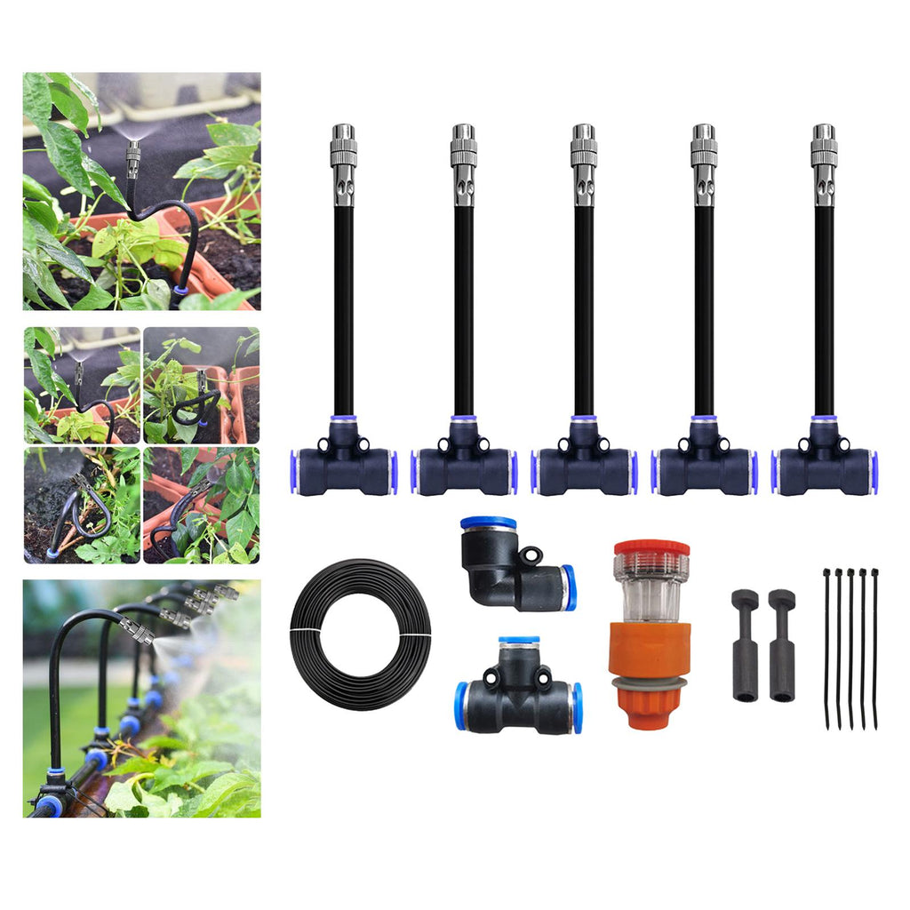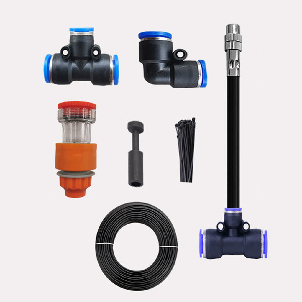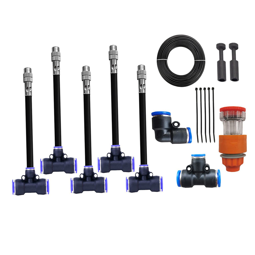 5 Sprayer Nozzles 6 Tee Connector 1 Elbow Connector 1 Water Pipe(5m) 1 Inner Adapter Filter 2 Water Pipe Plug 5 Black TiesNote: