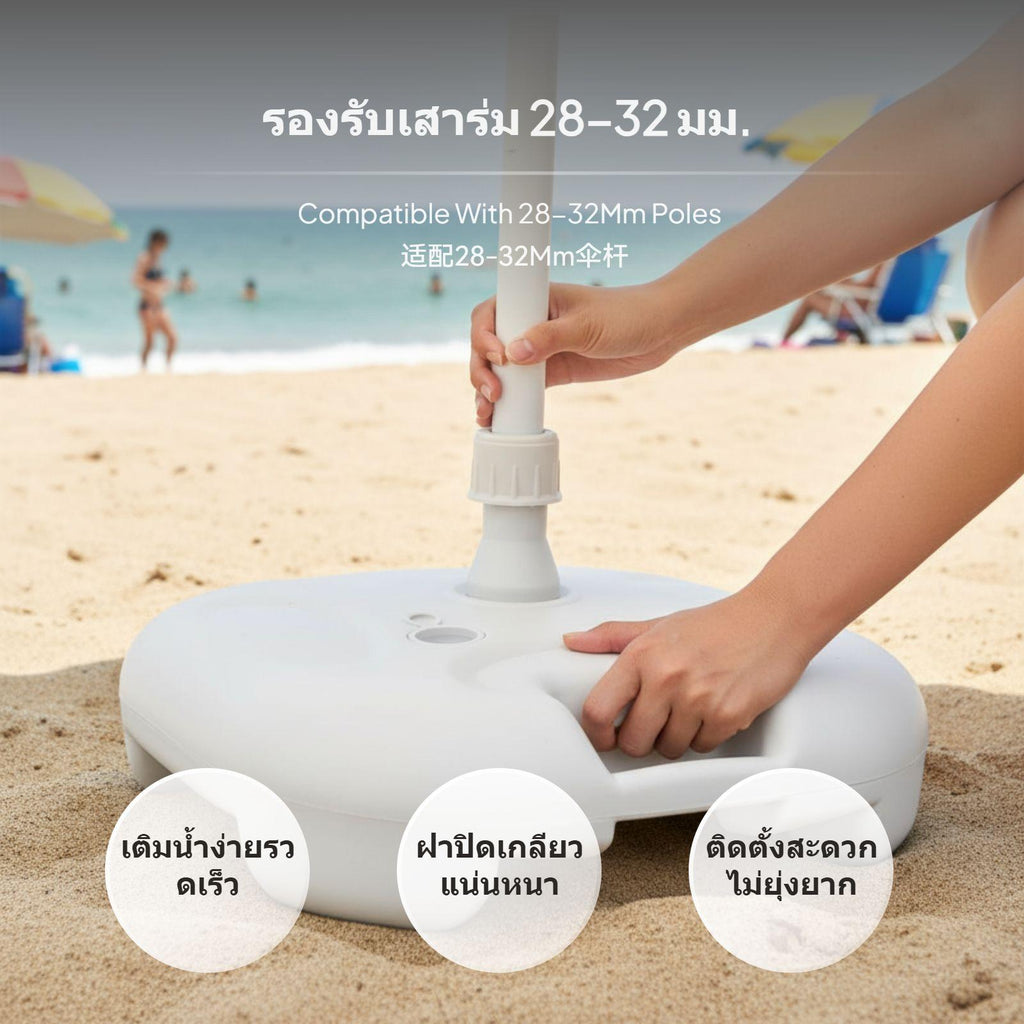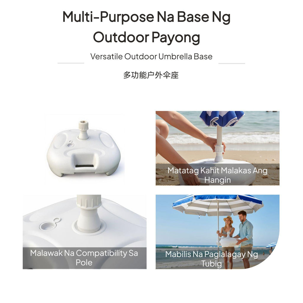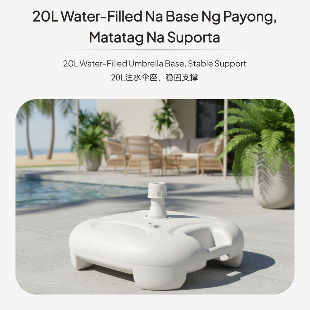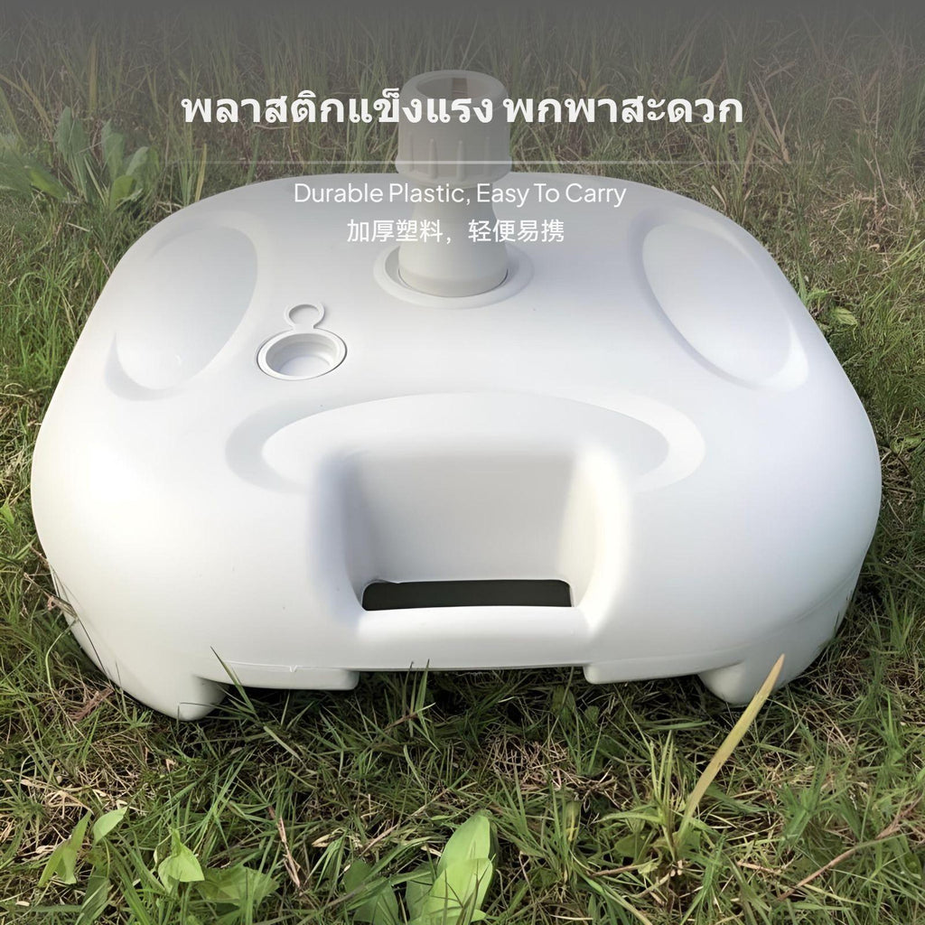 【Stable Water-Filled Umbrella Base for Outdoor Use】This umbrella base provides dependable support for patio, beach, and garden umbrellas, ensuring stability even in breezy conditions. The water-filled design allows for up to 20kg weight, preventing your umbrella from tipping over.【sturdy Plastic Construction】Made from high-quality plastic, this base is built to withstand outdoor environments, offering longlongevity for various outdoor settings.【Wide Compatibility and Easy Installation】Suitable for umbrella poles with diameters of 28-32mm, the base features a screw cap for stable fixing and a convenient water inlet for quick filling.【Portable and Convenient Design】Weighing only 0.9kg when empty and equipped with an integrated handle, this base is easy to carry and move before and after filling.【perfect for Multiple Outdoor Scenarios】Perfect for patios, beaches, lawns, and markets, this umbrella base is a practical accessory for outdoor furniture, providing strong support and easy setup.