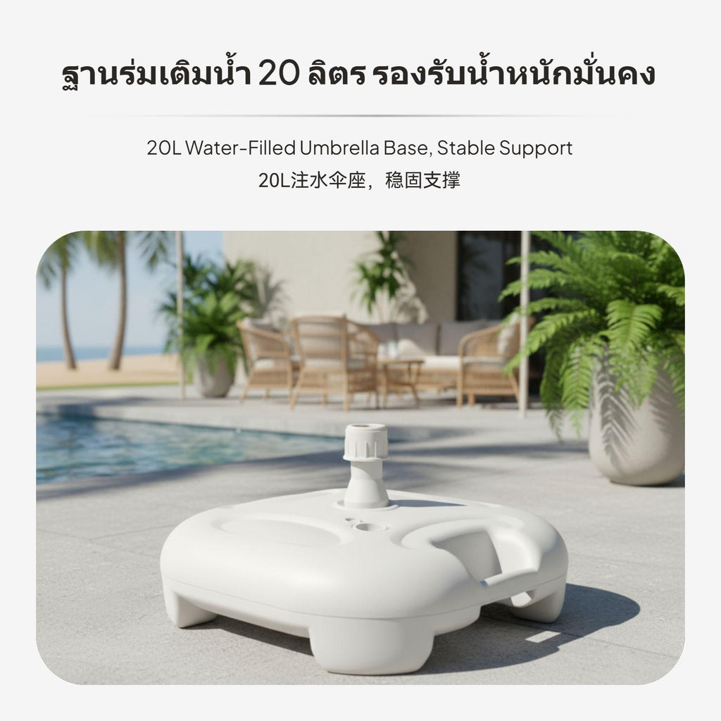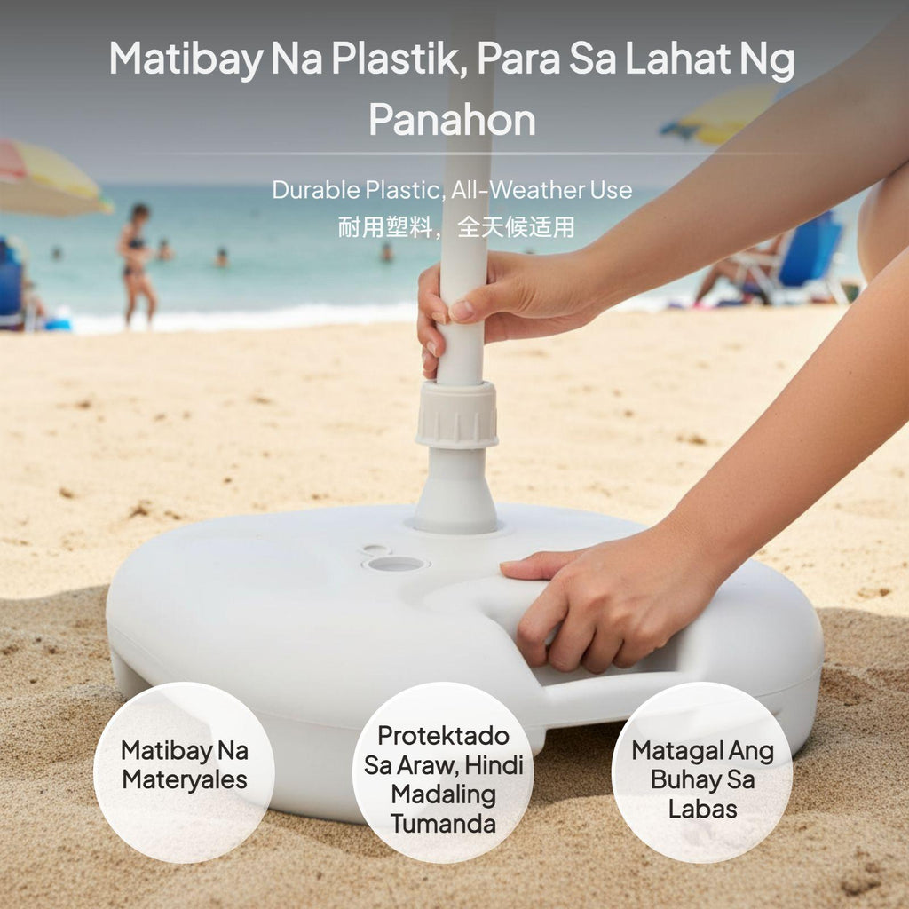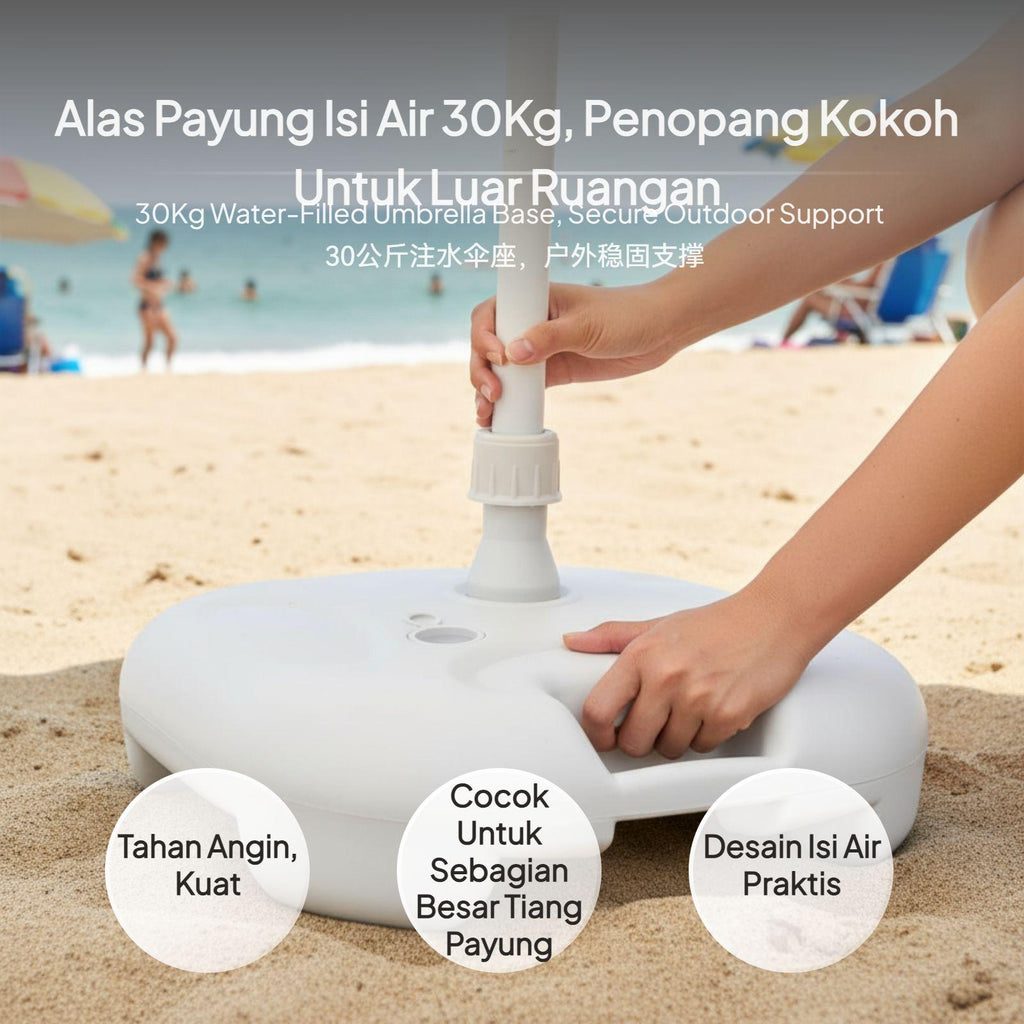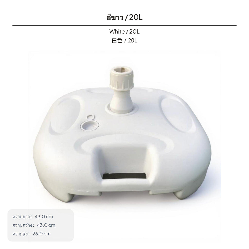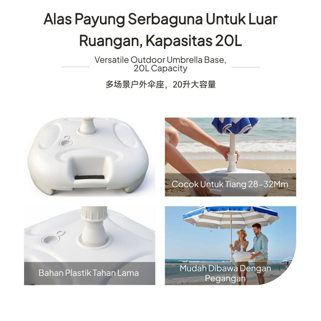 【Stable Water-Filled Umbrella Base for Outdoor Use】This umbrella base provides dependable support for patio, beach, and garden umbrellas, ensuring stability even in breezy conditions. The water-filled design allows for up to 20kg weight, preventing your umbrella from tipping over.【sturdy Plastic Construction】Made from high-quality plastic, this base is built to withstand outdoor environments, offering longlongevity for various outdoor settings.【Wide Compatibility and Easy Installation】Suitable for umbrella poles with diameters of 28-32mm, the base features a screw cap for stable fixing and a convenient water inlet for quick filling.【Portable and Convenient Design】Weighing only 0.9kg when empty and equipped with an integrated handle, this base is easy to carry and move before and after filling.【perfect for Multiple Outdoor Scenarios】Perfect for patios, beaches, lawns, and markets, this umbrella base is a practical accessory for outdoor furniture, providing strong support and easy setup.