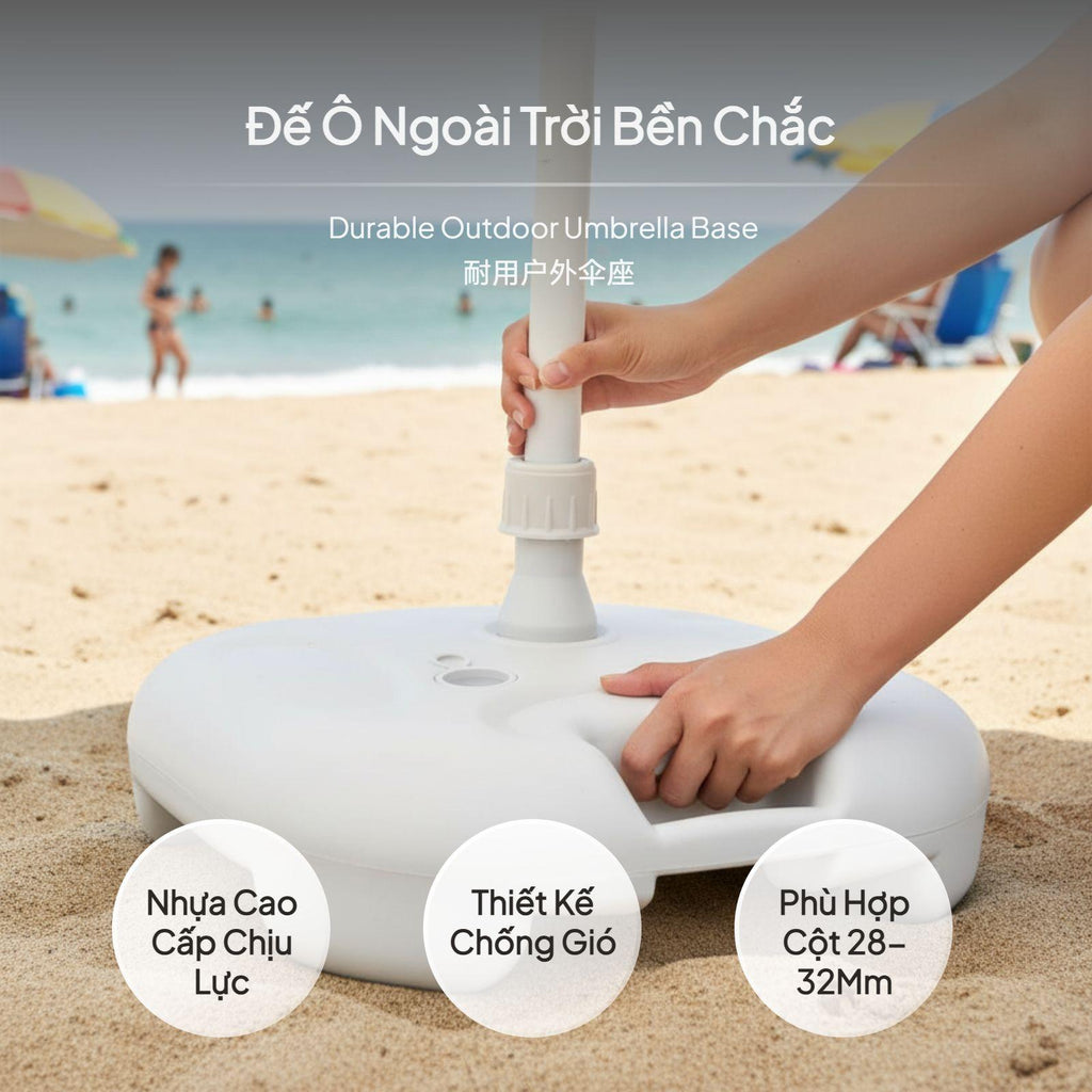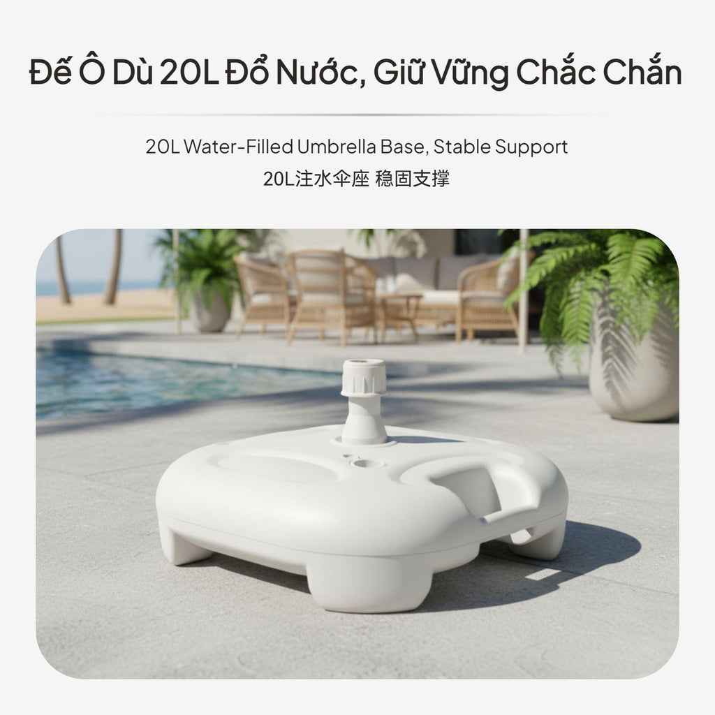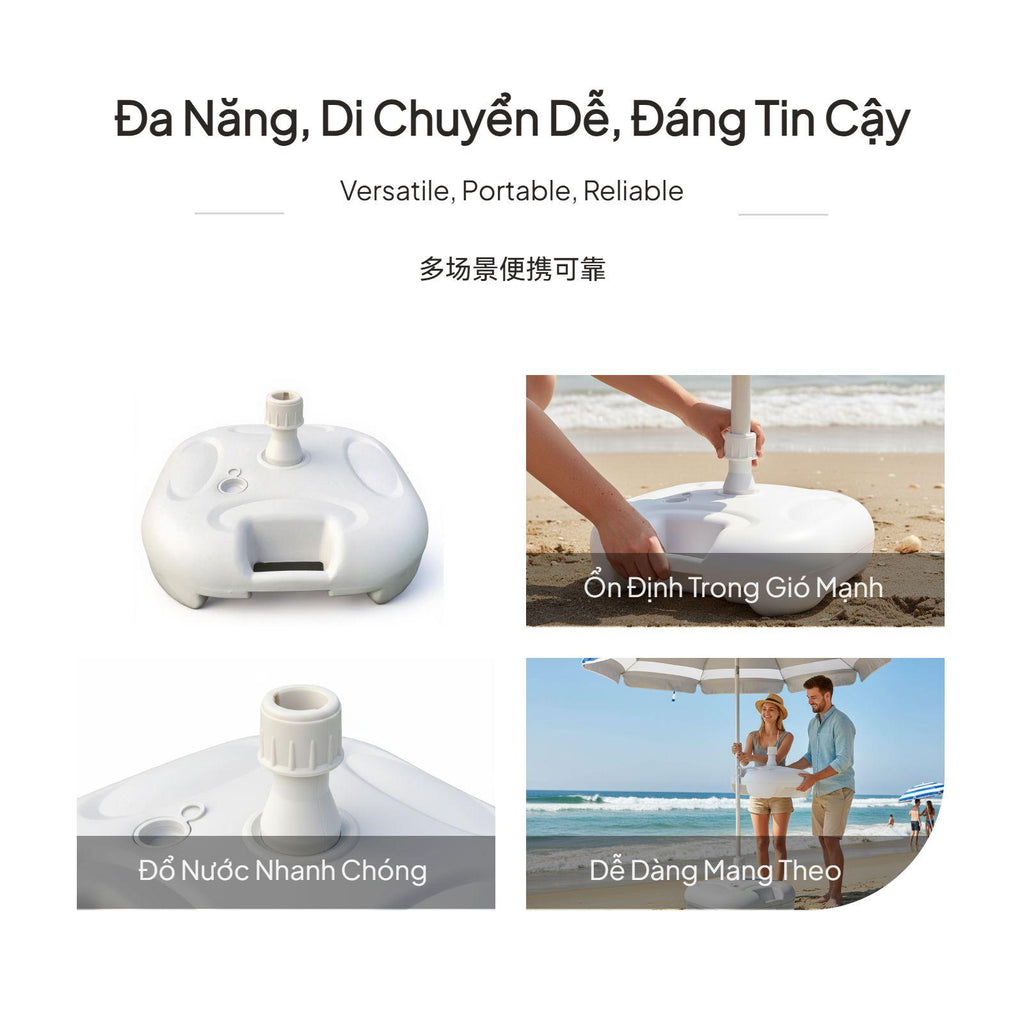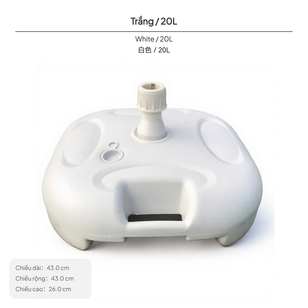 【Stable Water-Filled Umbrella Base for Outdoor Use】This umbrella base provides dependable support for patio, beach, and garden umbrellas, ensuring stability even in breezy conditions. The water-filled design allows for up to 20kg weight, preventing your umbrella from tipping over.【sturdy Plastic Construction】Made from high-quality plastic, this base is built to withstand outdoor environments, offering longlongevity for various outdoor settings.【Wide Compatibility and Easy Installation】Suitable for umbrella poles with diameters of 28-32mm, the base features a screw cap for stable fixing and a convenient water inlet for quick filling.【Portable and Convenient Design】Weighing only 0.9kg when empty and equipped with an integrated handle, this base is easy to carry and move before and after filling.【perfect for Multiple Outdoor Scenarios】Perfect for patios, beaches, lawns, and markets, this umbrella base is a practical accessory for outdoor furniture, providing strong support and easy setup.