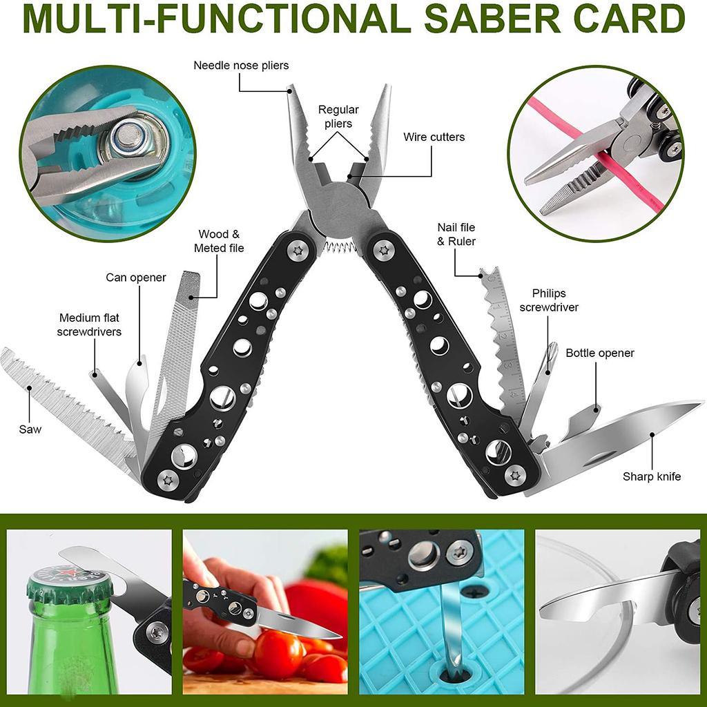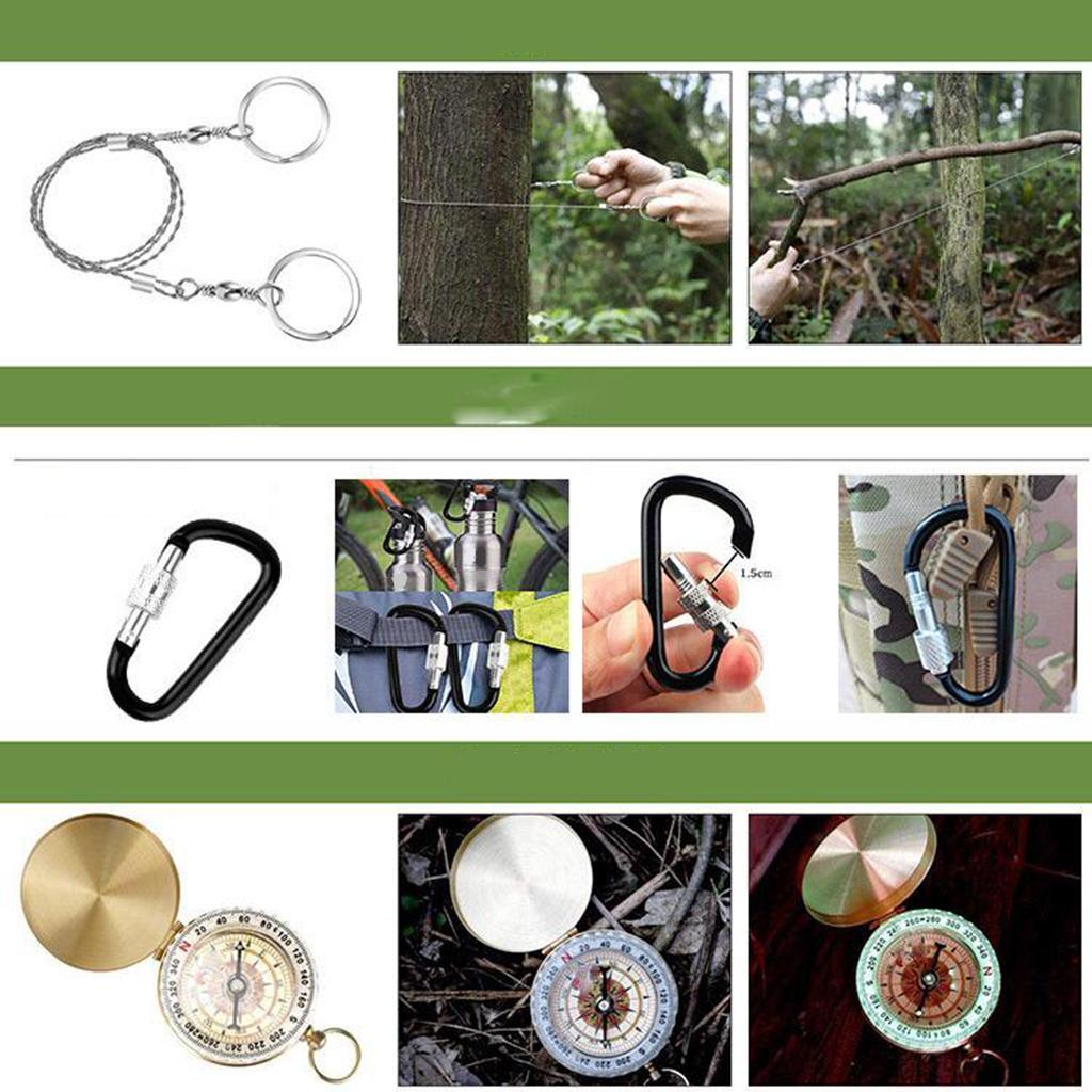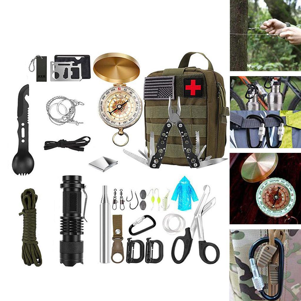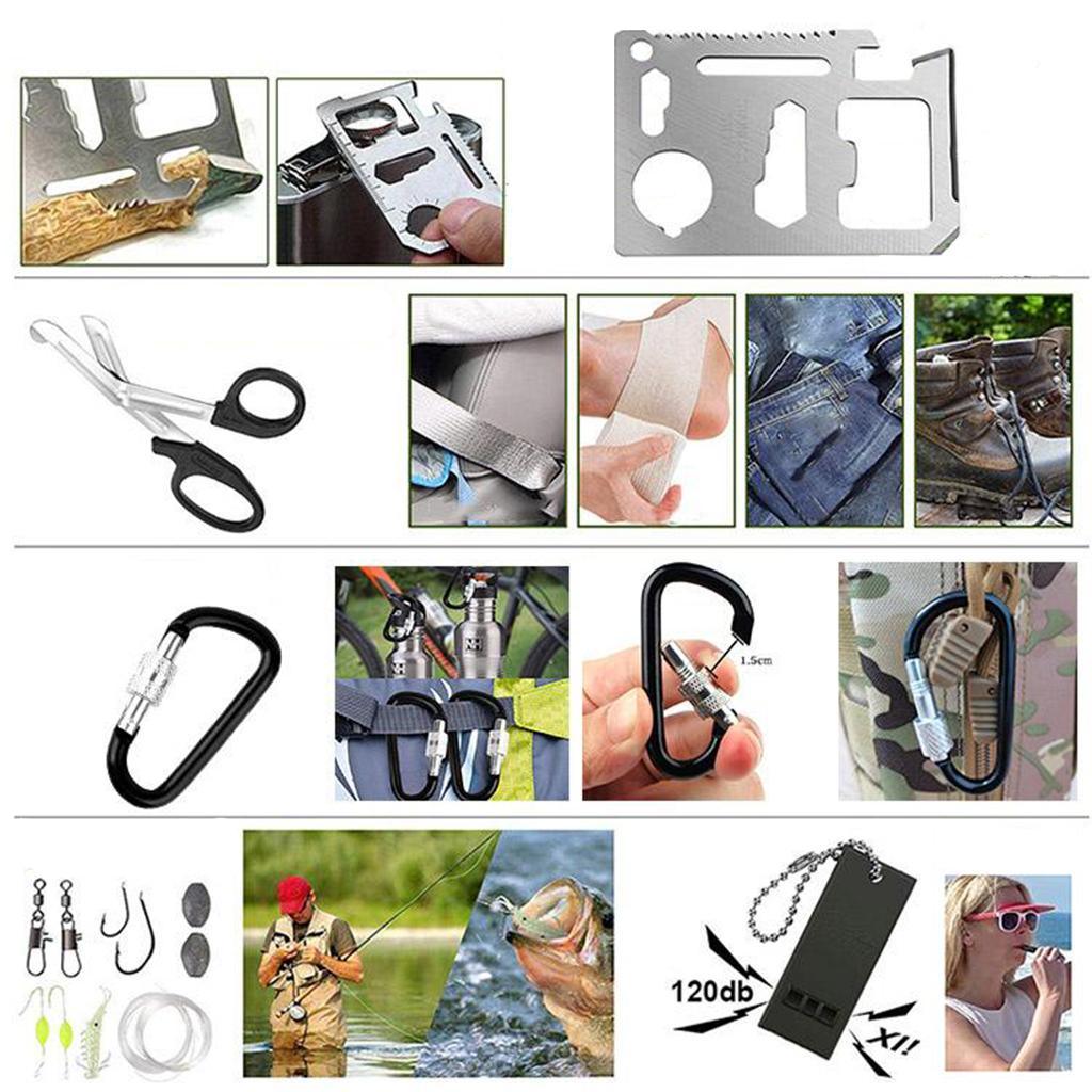 Professional Emergency Survival Kit --- Included flashlight, compass, wire saw, plier, emergency blanket, raincoat, multi use spork, whistle, multifunctional card, fishing equipment, parachute cord, blowpipe, buckle, carabiner, D ring carabiner, scissors, tactical backpack.