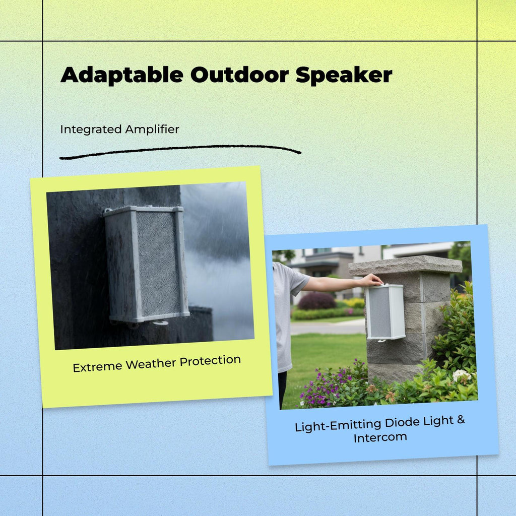 【Outdoor Waterproof Speaker for All-Weather Use】This wall-mounted aluminum speaker post features a waterproof and weather-resistant enclosure, ensuring dependable performance in outdoor environments such as workshops, garages, schools, and public areas.【Built-in Intercom and Broad Sound Coverage】Equipped with a built-in intercom and digital amplifier, this speaker delivers clear voice announcements and wide audio coverage to meet security, public address, and communication needs.【Sturdy Aluminum Alloy Construction】Constructed from robust aluminum alloy, this speaker provides enhanced protection against rain and debris, making it suitable for both indoor and outdoor installation.【Easy Installation】Designed for wall mounting, this speaker system offers quick, straightforward installation and userintuitive controls for volume adjustment and voice functions.【Adaptable Application Scenarios】perfect for commercial spaces, factories, schools, parks, and more, this speaker supports security alerts, advertising playback, and public broadcasting.