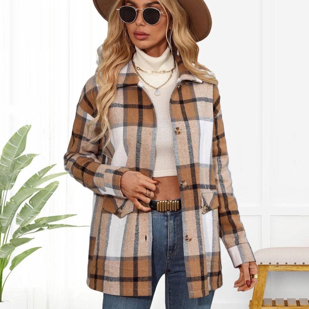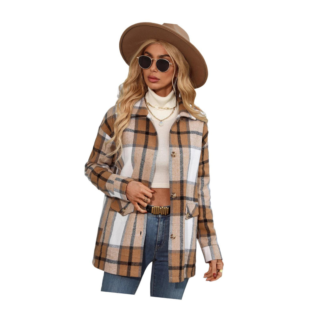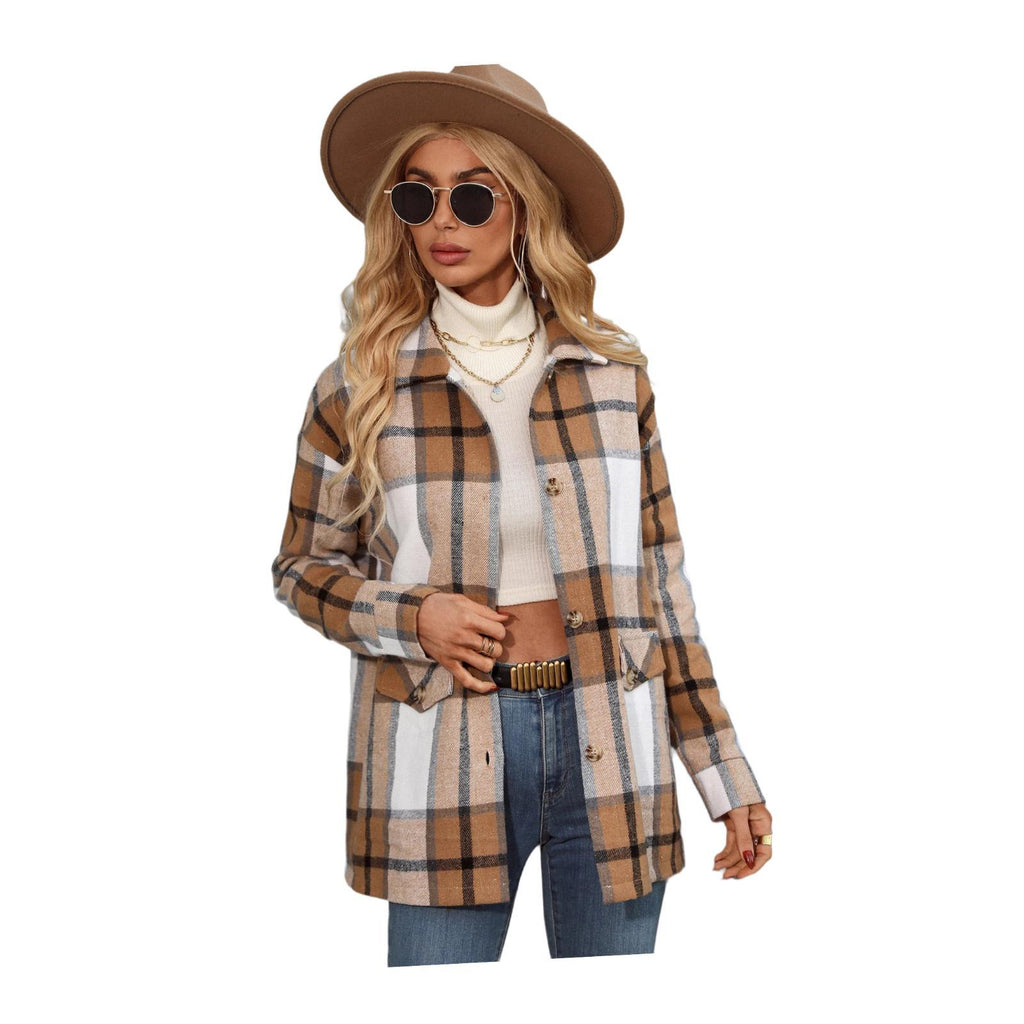 Maxbell Plaid Shirt Clothes with Pocket Fashion Womens Shirt for Outdoor Winter Work L Khaki