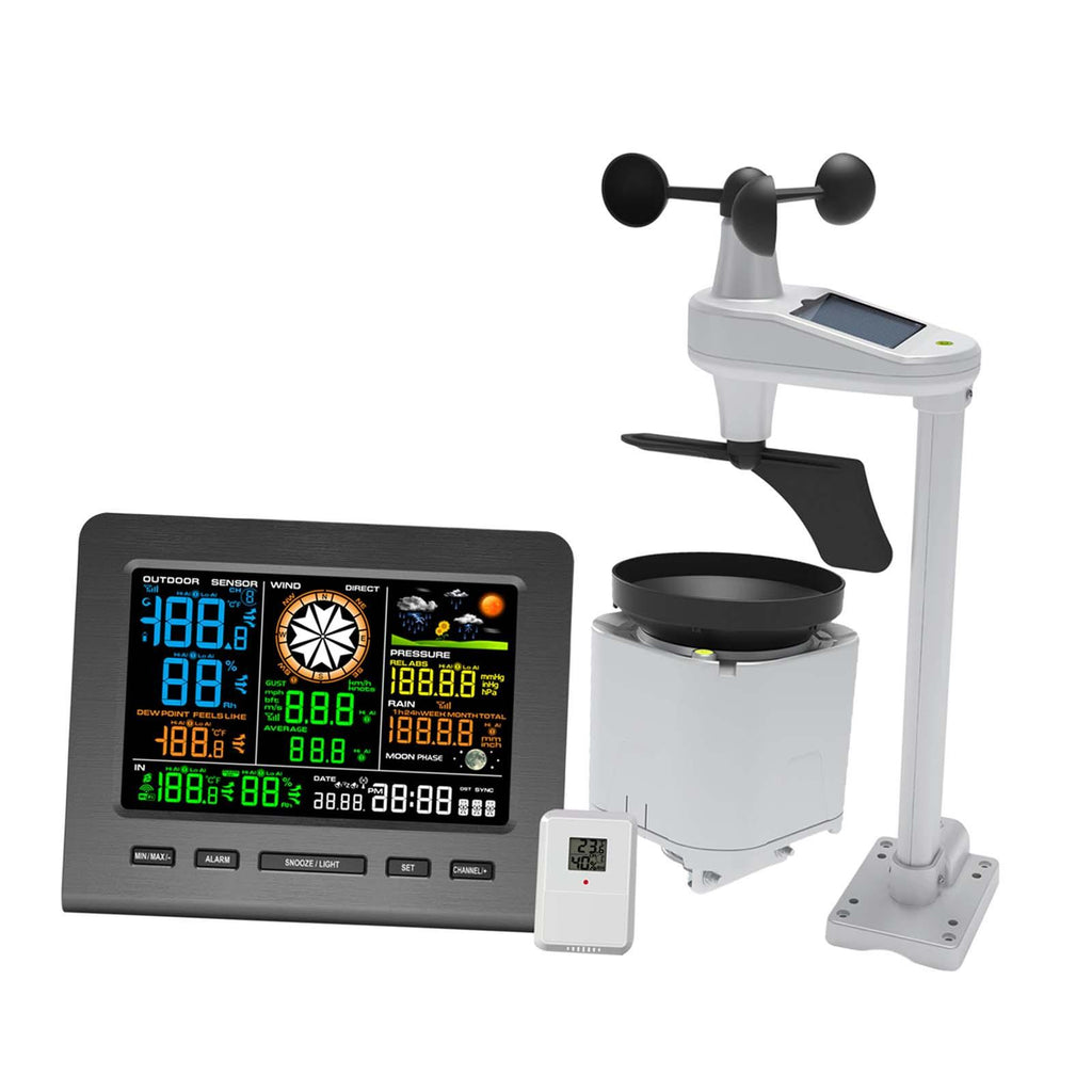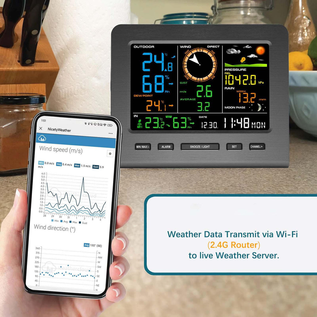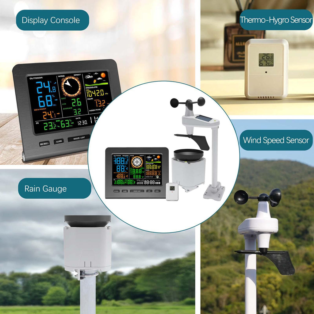 【Comprehensive Weather Monitors】: The Weather Station offers a 5-in-1 functionality, providing real time data on wind speed, wind direction, rainfall, indoor and outdoor temperature and humidity, atmospheric pressure, and 24-hour weather forecasting