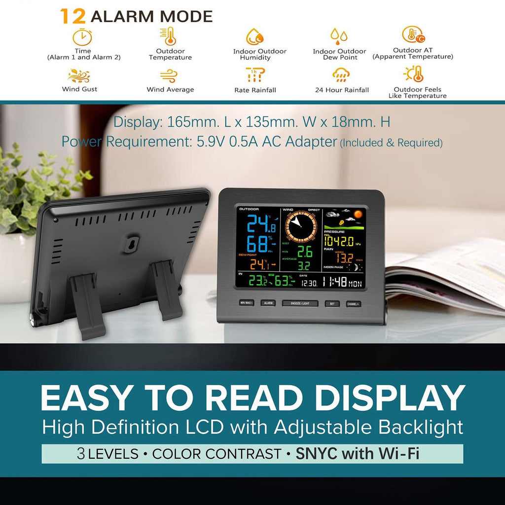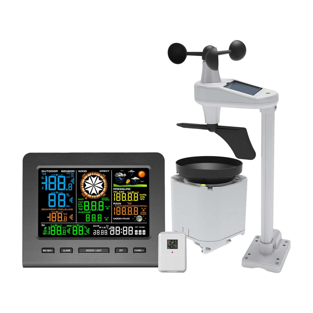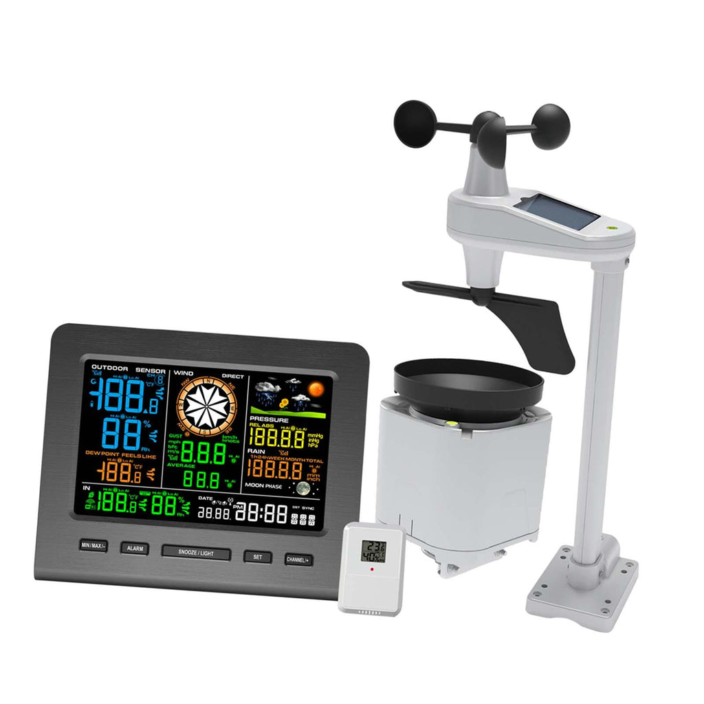 【Comprehensive Weather Monitors】: The Weather Station offers a 5-in-1 functionality, providing real time data on wind speed, wind direction, rainfall, indoor and outdoor temperature and humidity, atmospheric pressure, and 24-hour weather forecasting