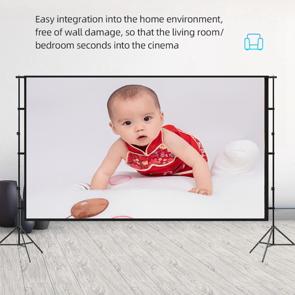 【Versatile and Stylish】: This 16:9 portable projector screen with stand effortlessly blends into your home environment, transforming your living room or bedroom into a cinema without damaging the walls.