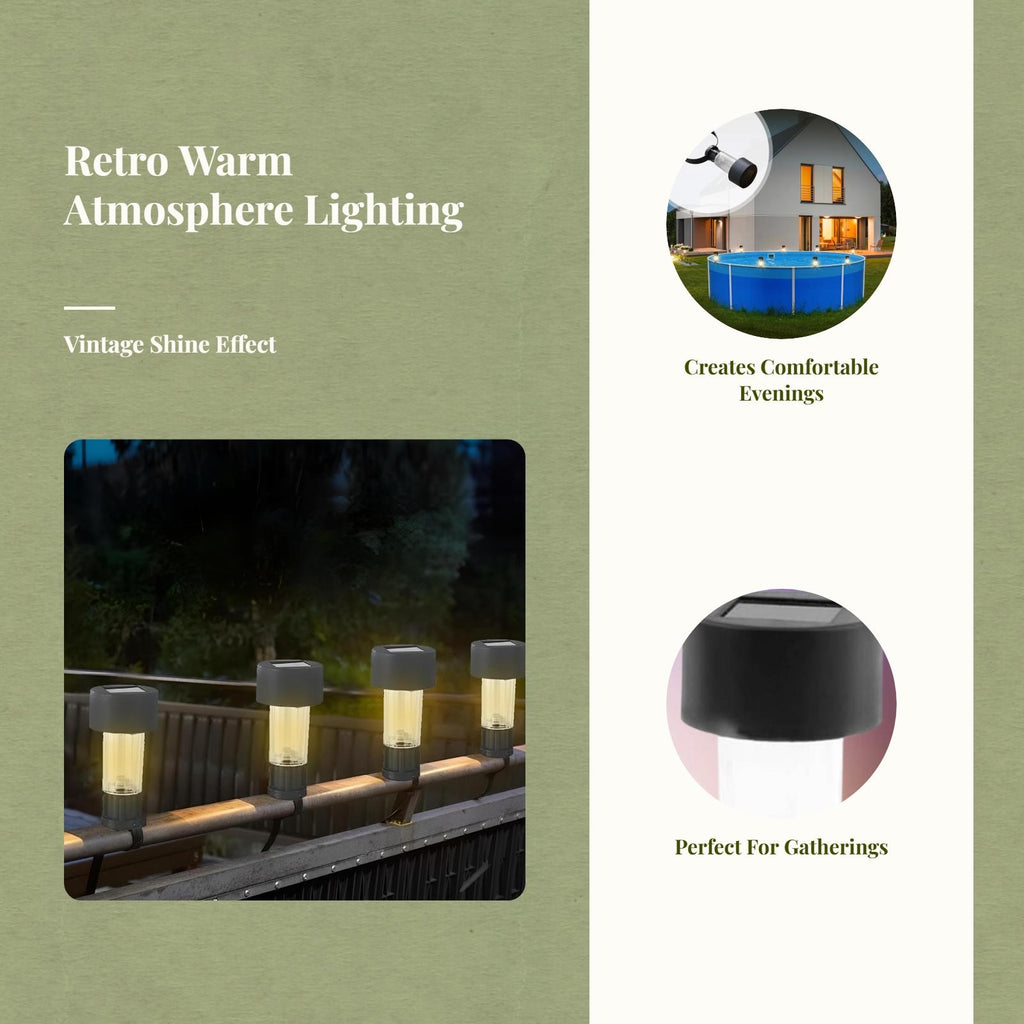 【Solar Garden Light for Outdoor Ambience】Create an enchanting atmosphere in your yard, patio, or garden with this solar-powered lantern. The vintage design and hollow pattern bring decorative design to fences, balconies, and porches.【Waterproof and resilient for All Weather】IP55 waterproof ensures dependable performance in rain or glow, making it perfect for outdoor use on decks, courtyards, and landscaping.【Easy Installation】No wiring required—simply use the included strap to hang or attach the lantern to railings, fences, or balconies for instant lighting and decoration.【Automatic Charging and Long lighting】Solar-powered with automatic charging during the day, providing 6-12 hours of continuous lighting at night to enhance your outdoor atmosphere.【Versatile Decorative Lighting】Perfect for the home, garden, yard, patio, porch, and balcony, this portable lantern is perfect for a variety of events and adds a tint of vintage appeal to any outdoor space.Specification: