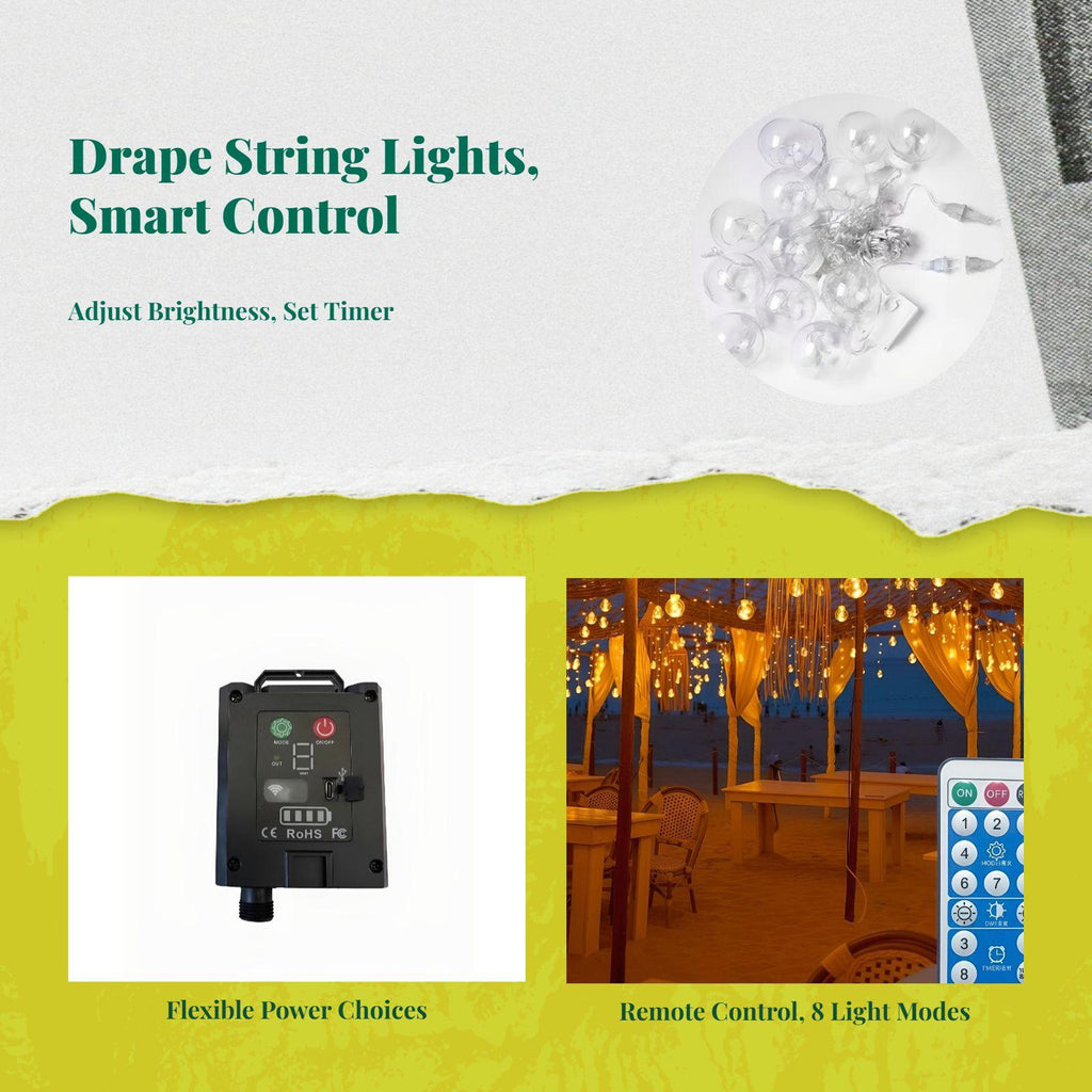 【Solar String Lights for Outdoor Ambience】These solar-powered string lights provide energy-saving, waterproof lighting for patios, gardens, and balconies, creating a warm and decorative atmosphere in any outdoor environment. 【Easy Installation & Cordless Use】No wiring required—simply place the lights anywhere you need the lights. The automatic lighting feature ensures effortless use for gardens, yards, or pathways. 【Multiple Lighting Modes & Dimmable】Featuring 8 lighting modes and adjustable brightness, these lights are perfect for events like parties, weddings, and festive events, elevating your outdoor decor. 【sturdy, Weatherproof Design】Constructed with IP65 waterproof materials, these lights are built to withstand rain and harsh conditions, making the lights perfect for year-round outdoor use. 【Versatile Decorative Lighting】perfect for patios, balconies, lawns, and walkways, these solar string lights add a glimpse of elegance and practical lighting to your home’s exterior.Specification: