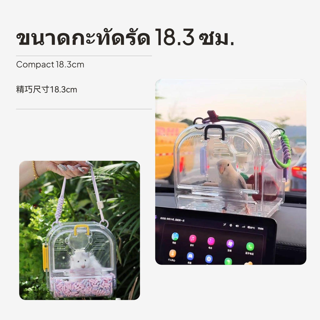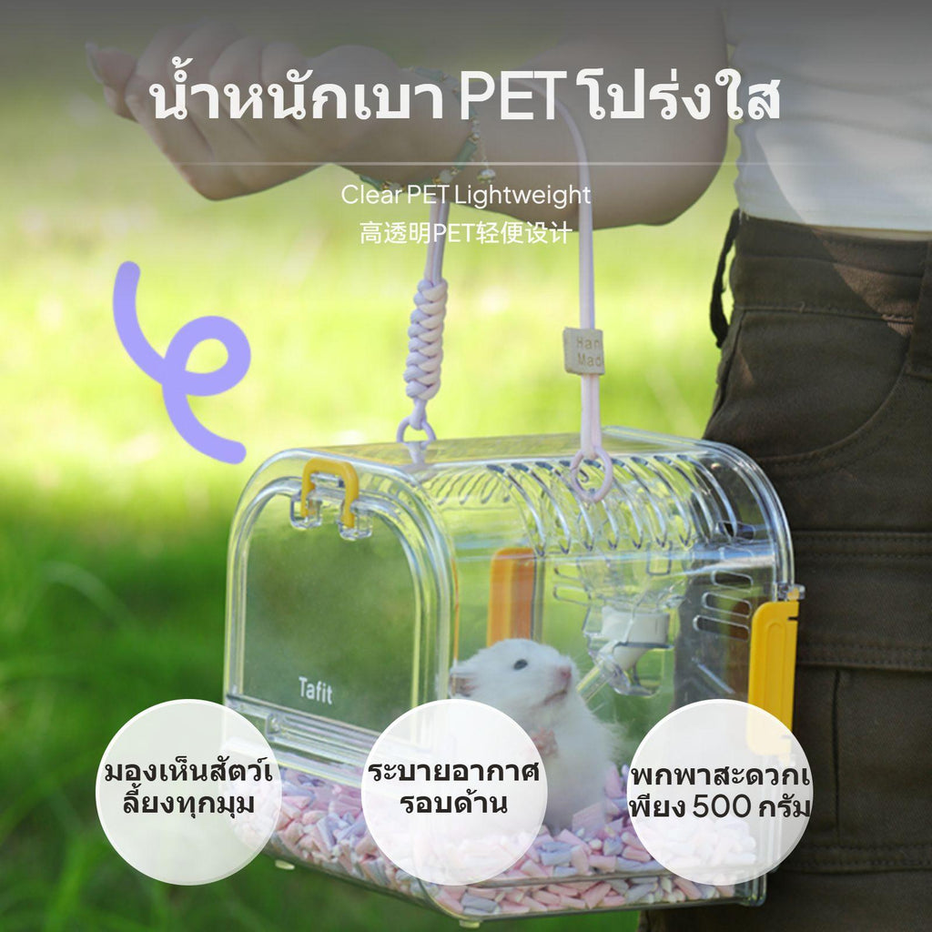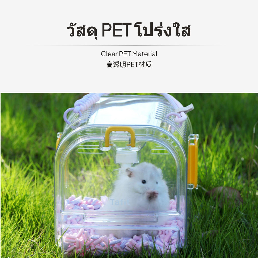 [Versatile Portable Design] Transparent portable hamster travel cage suitable for hamsters, Syrian hamsters, and sugar gliders; lightweight and easy to carry for outdoor trips, moving, or gatherings.[High Transparency Material] Made of durable, high-transparency PET plastic, allowing you to observe your pet at any time and enhance interaction.[Breathable Ventilation] Features ventilation holes on all sides to ensure smooth airflow, keeping your pet comfortable and well-ventilated.[Secure & Practical] Dual safety locks on both ends prevent accidental escapes; built-in leak-proof water bottle supports hydration during short journeys.[Easy Cleaning & Random Color] Removable back panel for thorough cleaning; available in multiple colors shipped randomly, with optional felt cage cover for extra comfort and privacy.