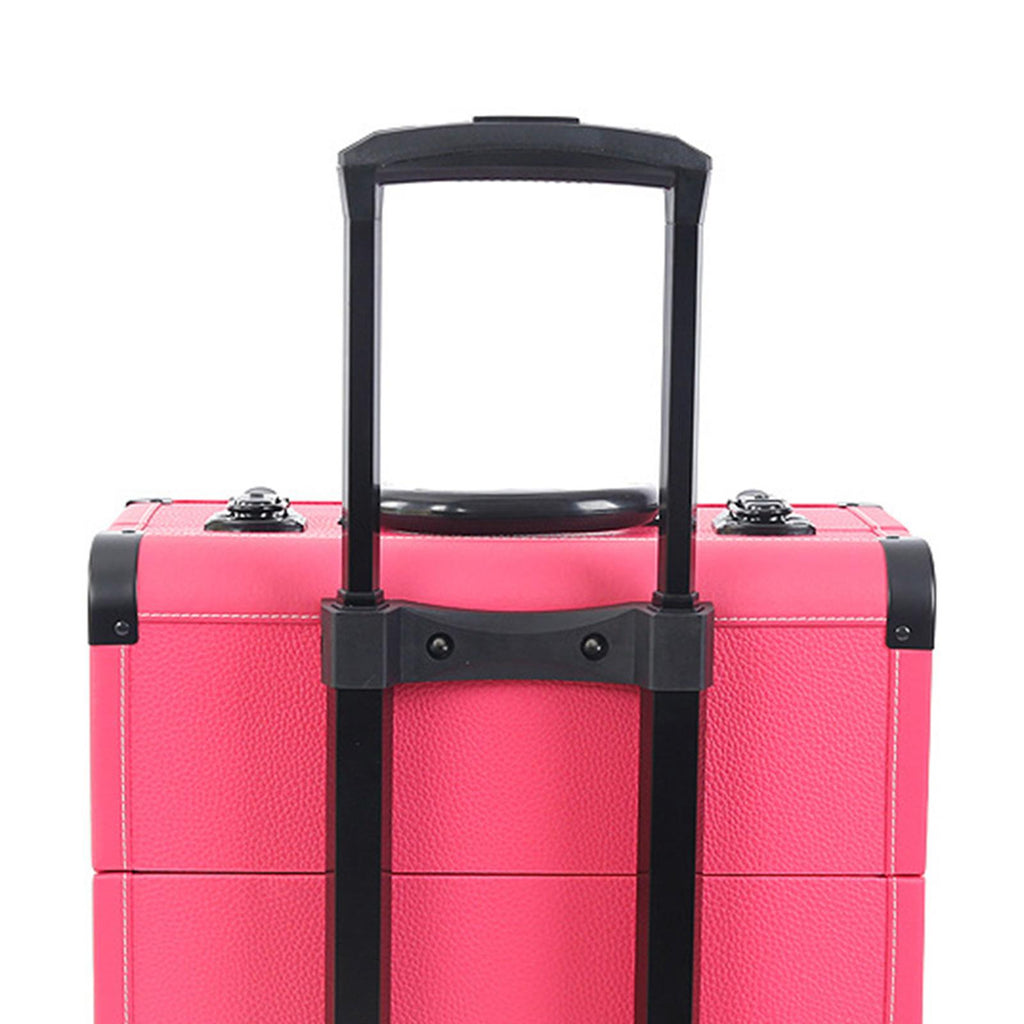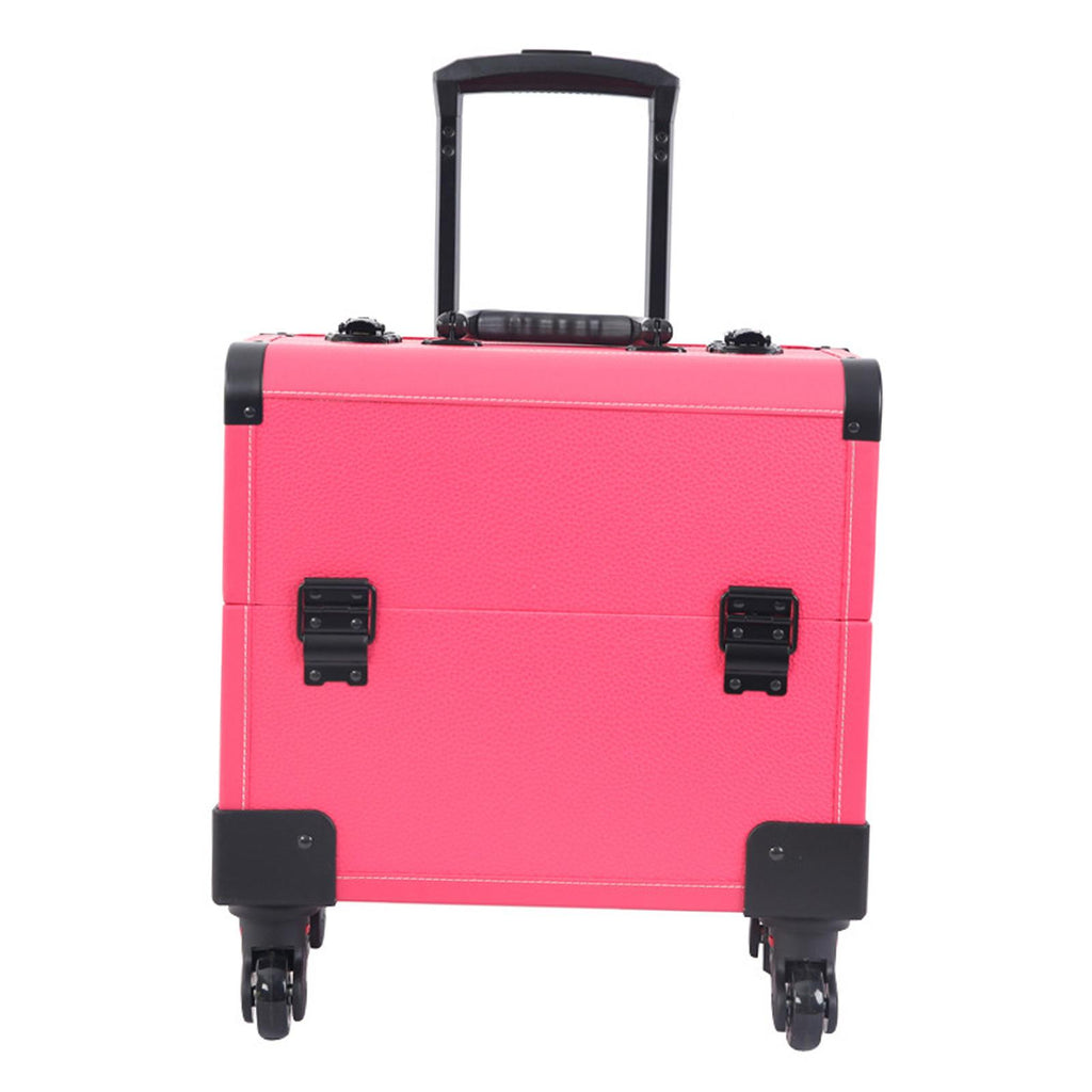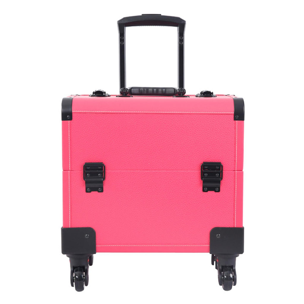 【Portable and Practical】: This lightweight and sturdy makeup case is equipped with a smooth trolley and wheels for easy carrying and movement. It features multiple compartments and pockets for easy storage and organization of various cosmetics and tools.