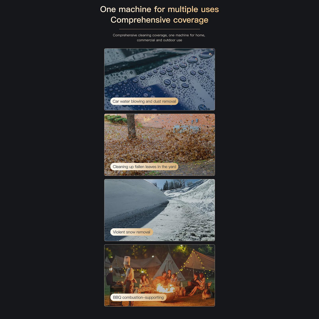 【Wide Application】: Mini blower is suitable for house dust removal, car washing and water removal, yard cleaning, outdoor snow removal, chassis dust removal, etc.