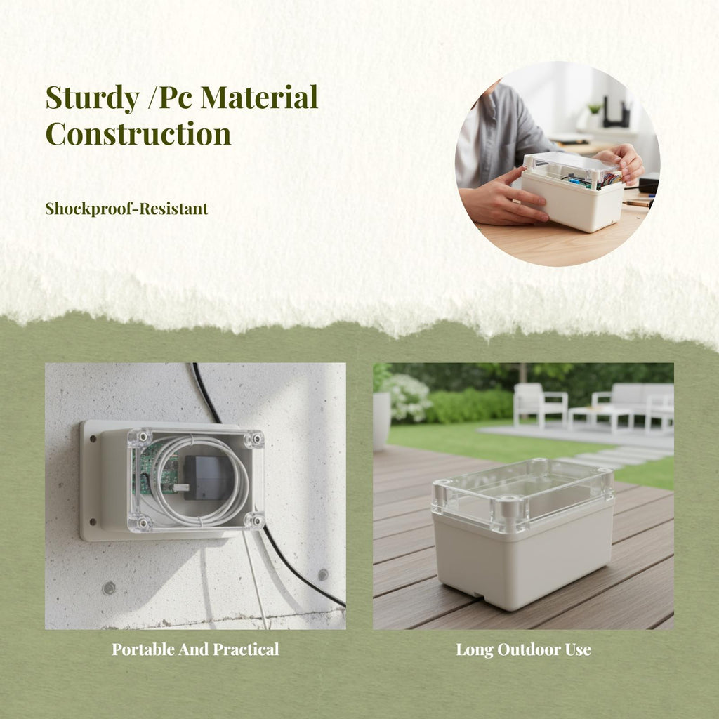 【Dependable Waterproof Junction Box for Indoor and Outdoor Use】This ABS enclosure with a clear cover offers IP67-rated protection against water and particles, making it perfect for safeguarding electronic linkages in harsh conditions and for general electronic projects.【sturdy ABS Material】Constructed from high-quality this junction box provides power insulation and long durability, suitable for both indoor and outdoor use such as garden, sprinkler control, and lighting applications.【Easy Installation and Maintenance】The hinged design ensures convenient entry for installation and repair, making it perfect for smart home DIY projects and equipment setups.【Versatile Application Scenarios】Perfect for protecting power supplies, timers, power strips, and outdoor electronic linkages, this enclosure is designed to perform well in environments with high humidity and challenging weather conditions.【Secure and Practical Design】The transparent cover allows for quick inspection of internal components, while the sealed framework delivers trustworthy protection against water, particles, and rain.Specification: