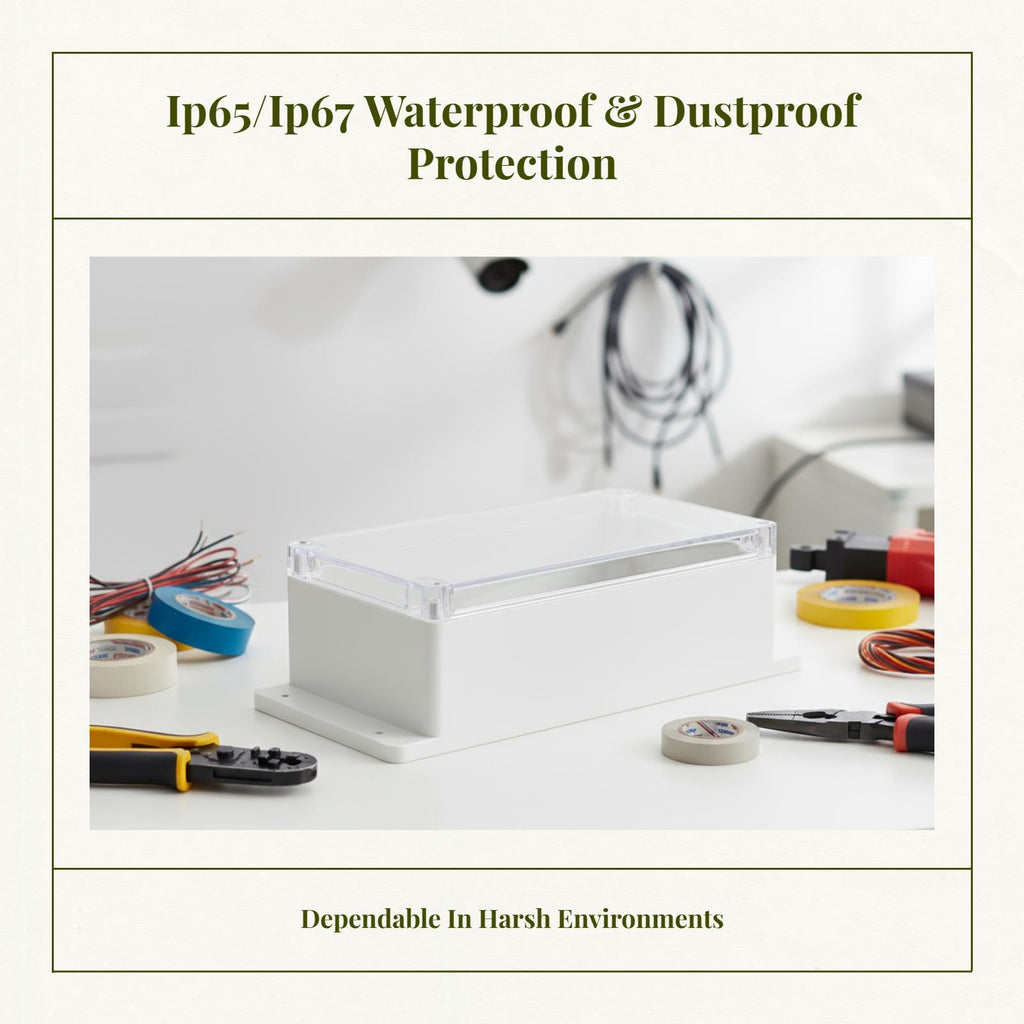 【Dependable Waterproof Junction Box for Indoor and Outdoor Use】This ABS enclosure with a clear cover offers IP67-rated protection against water and particles, making it perfect for safeguarding electronic linkages in harsh conditions and for general electronic projects.【sturdy ABS Material】Constructed from high-quality this junction box provides power insulation and long durability, suitable for both indoor and outdoor use such as garden, sprinkler control, and lighting applications.【Easy Installation and Maintenance】The hinged design ensures convenient entry for installation and repair, making it perfect for smart home DIY projects and equipment setups.【Versatile Application Scenarios】Perfect for protecting power supplies, timers, power strips, and outdoor electronic linkages, this enclosure is designed to perform well in environments with high humidity and challenging weather conditions.【Secure and Practical Design】The transparent cover allows for quick inspection of internal components, while the sealed framework delivers trustworthy protection against water, particles, and rain.
