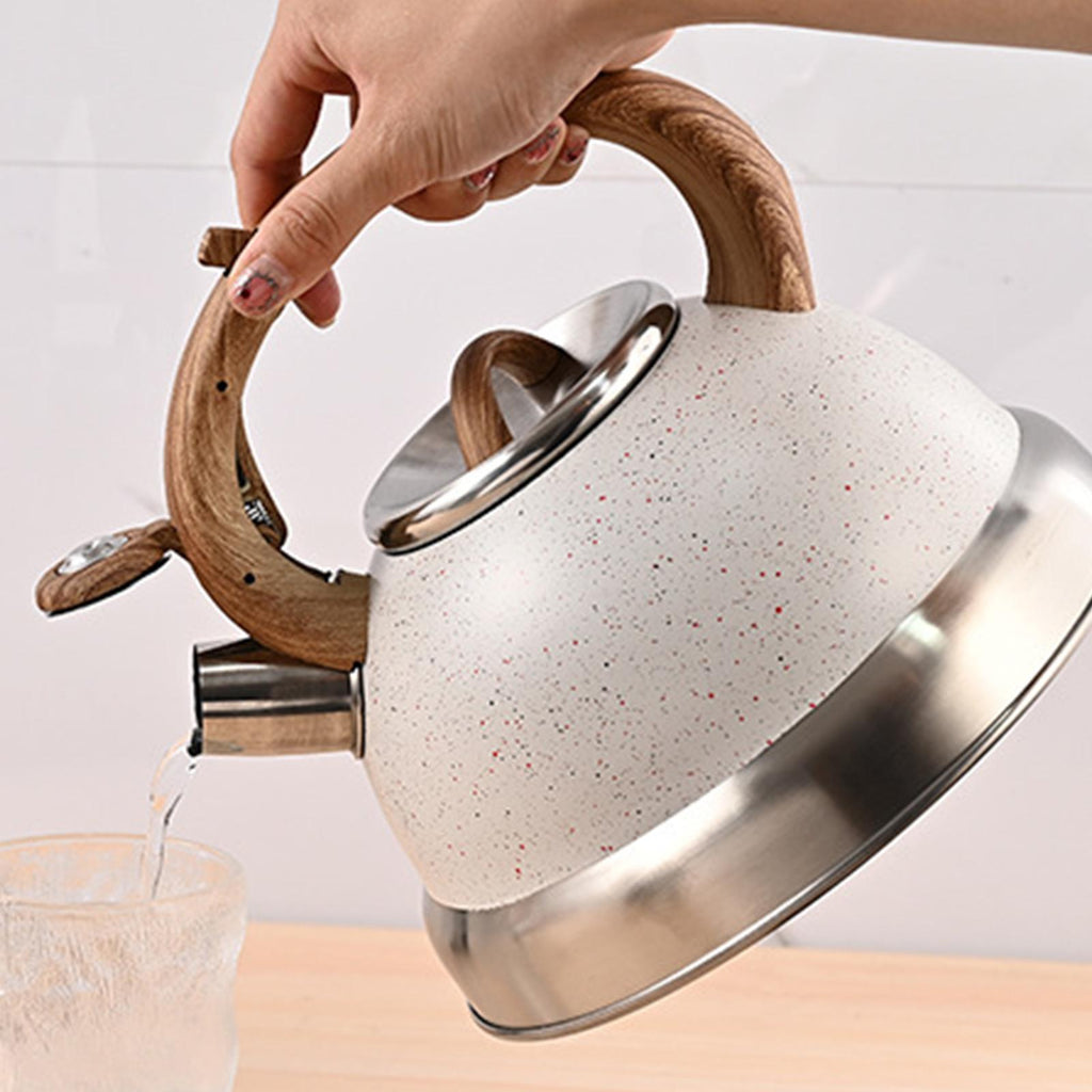 【Engineering Handle】: The Whistling Kettle with a wooden handle, comfortable grip, anti scald, flip up spout cover, safe and convenient for pouring and filling