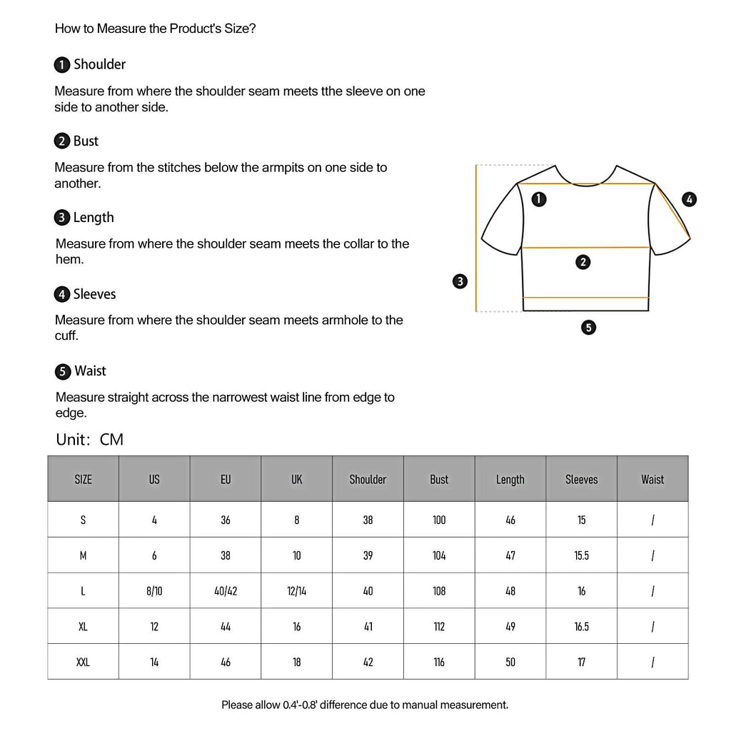 Bust 108cm/42.52inch,Length 48cm/18.90inch,Shoulder Width 40cm/15.75inch,Sleeve Length 16cm/6.30inchPackage Includes: