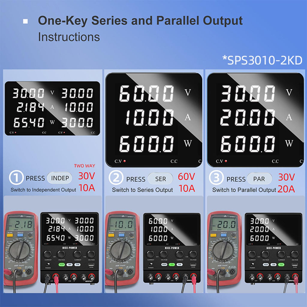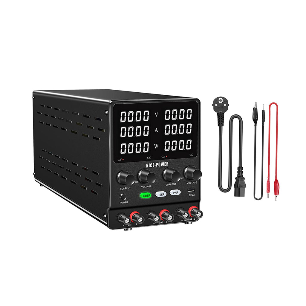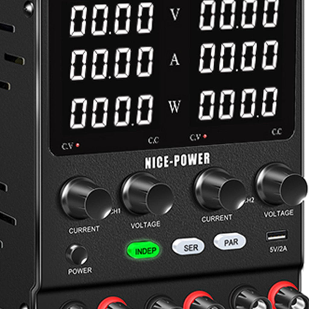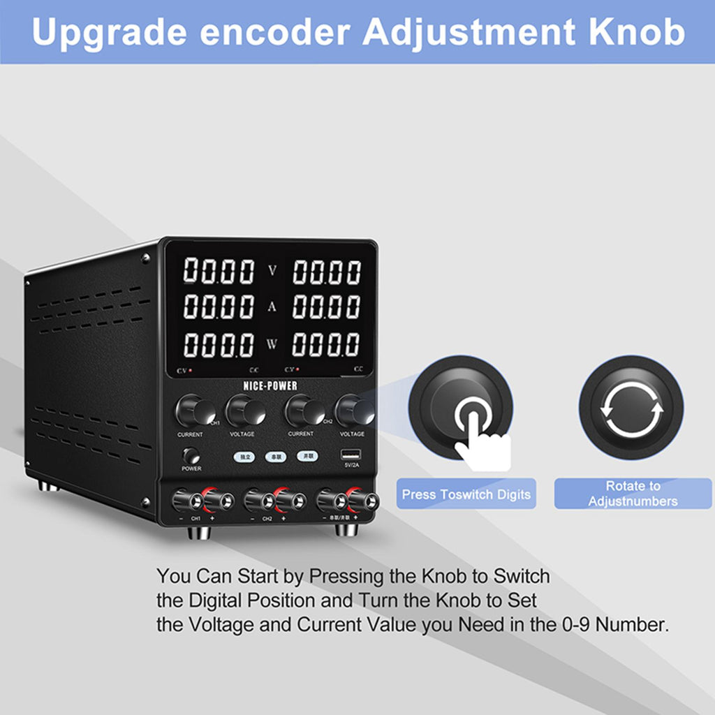 【Features】Adjustable Lab Power Supply, with Encoder Knob, can be coded and regulated. 5V/2A USB Port, 2 Channel, can output independently, can be connected in series, can be connected in parallel.