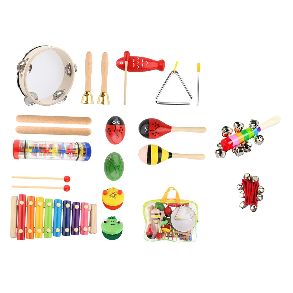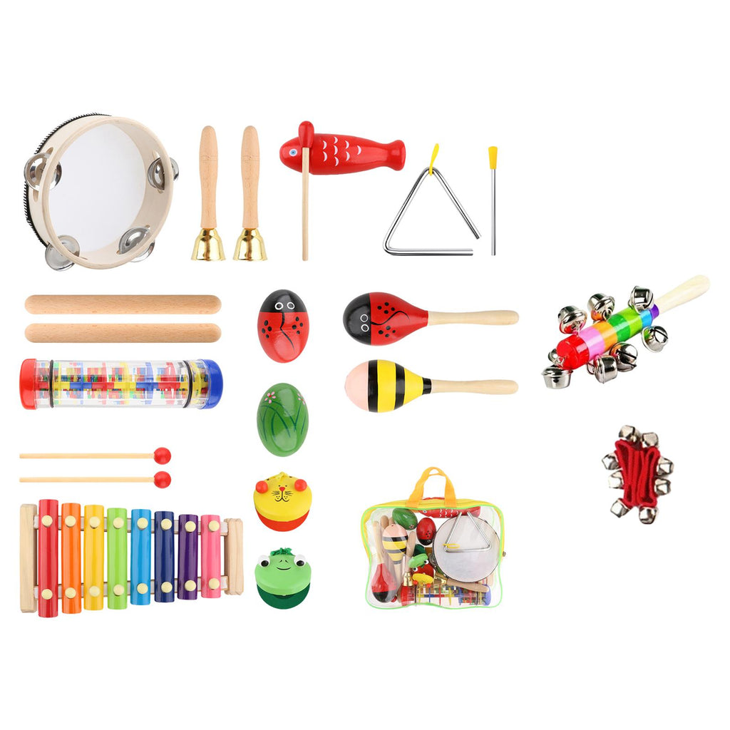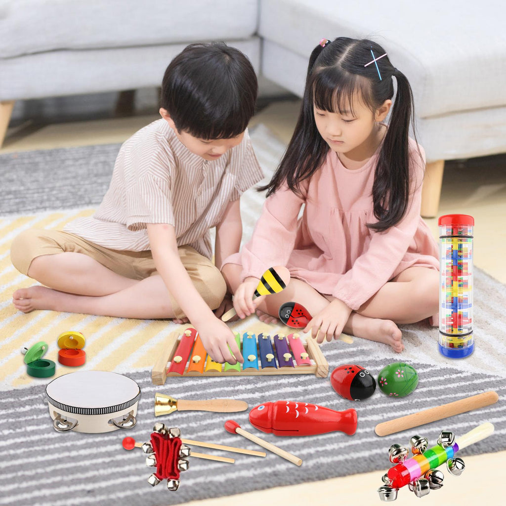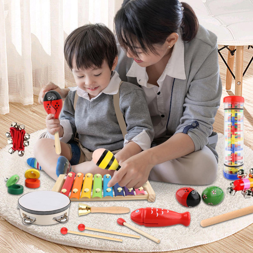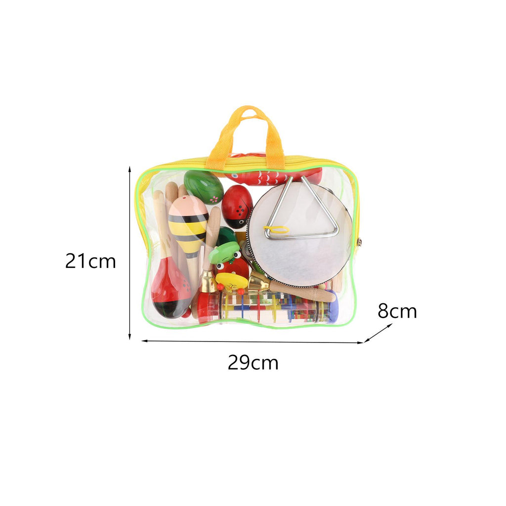 , tambourine, sand egg, triangle, dance board, rain sound tube, colored stick bell, wrist bell.【Music Educational Toy】: These wooden music percussion sets can develops music sensory and culitivate children's rhythm abilities, perfect for preschoolers.