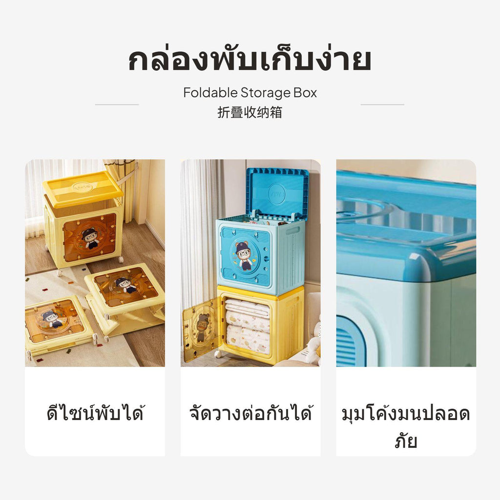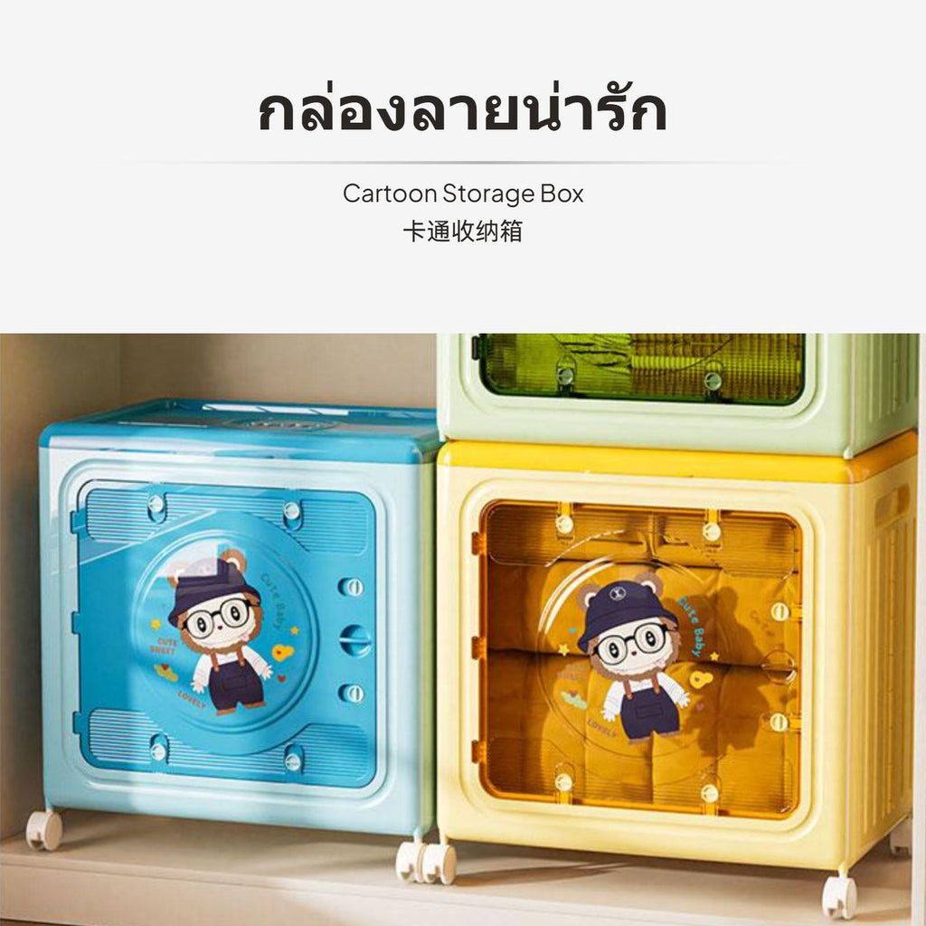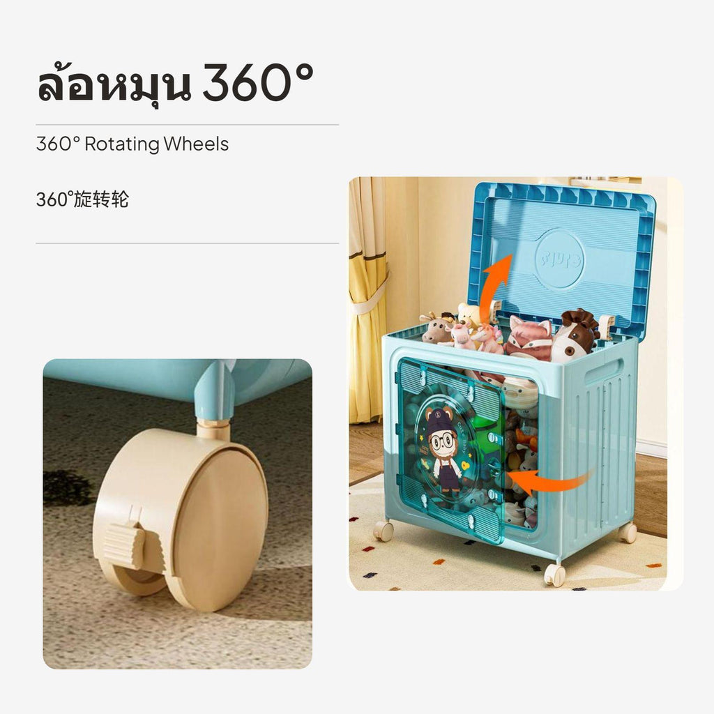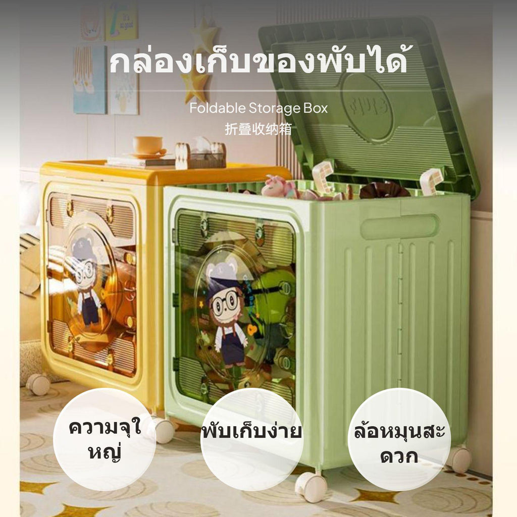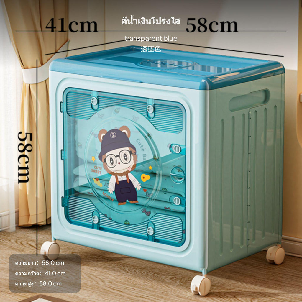 [Large Capacity & Versatility] This 130-liter storage box offers ample space to neatly organize clothes, toys, books, and other household items, making it suitable for various living spaces.[Innovative double-sidedOpening Design] Features a top flip lid and transparent front-opening door for flexible and convenient entry without the need to move the box.[Portable with Lockable casters] Equipped with 360° lockable rotating casters, this box is easy to move between rooms and ensures stability when stationary.[Foldable & Stackable Design] Save space with its foldable design when not in use, and stack multiple units to maximize upright storage in your home.[Stylish & Childappealing to children Appearance] Decorated with a fun cartoon cartoon creature design, available in lively opaque and transparent hues, adding appeal to kids' rooms, living rooms, or bedrooms.Specification: