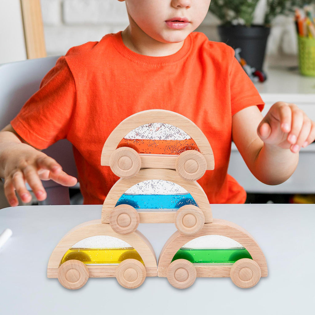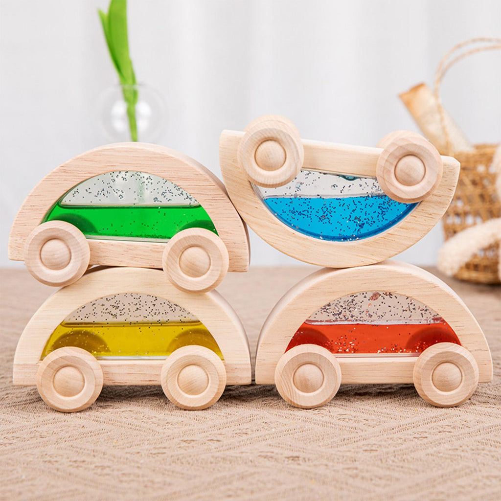 【Sequins Design】 Colorful Wooden Vehicle Set Toy is designed with sequins and Acrylic flowing water.