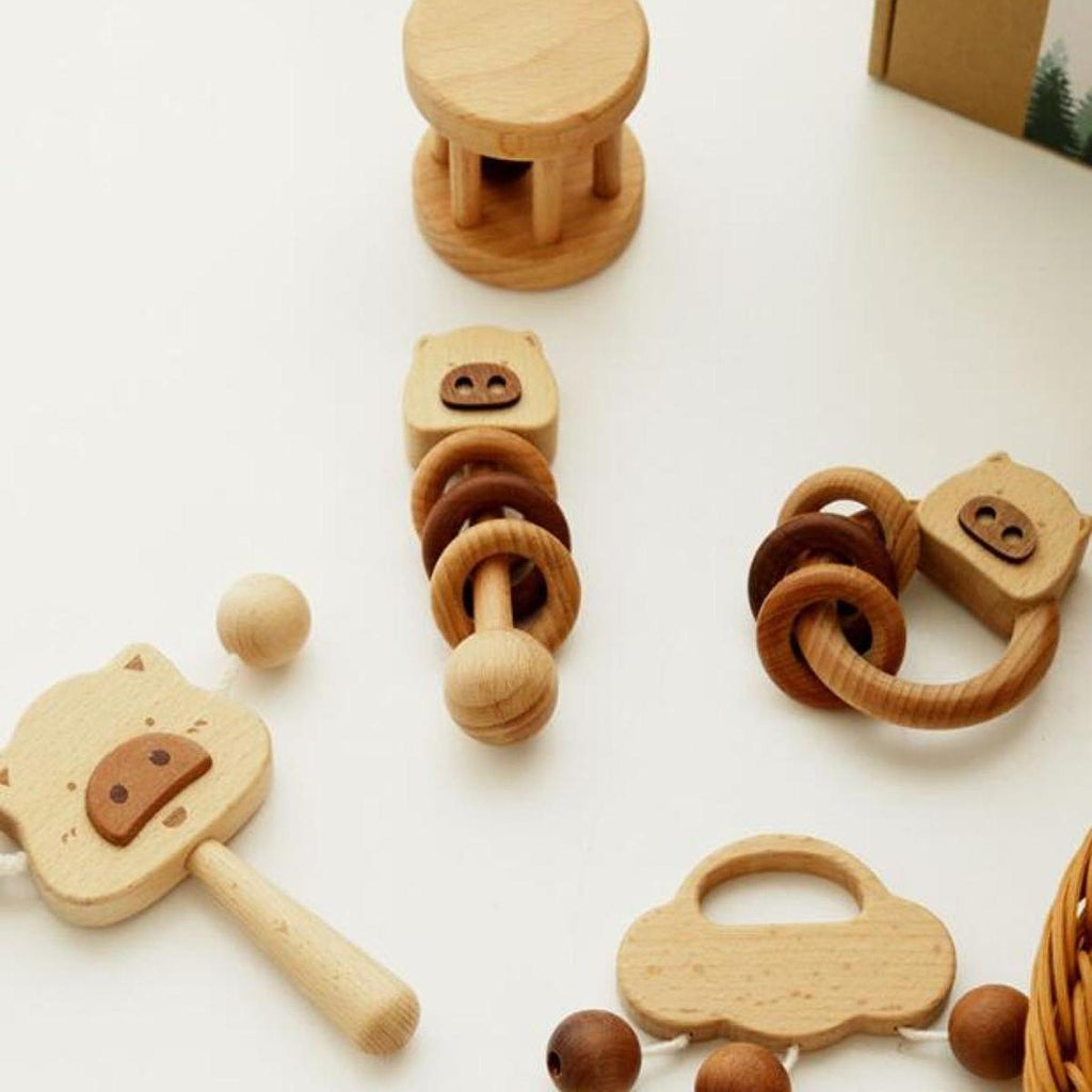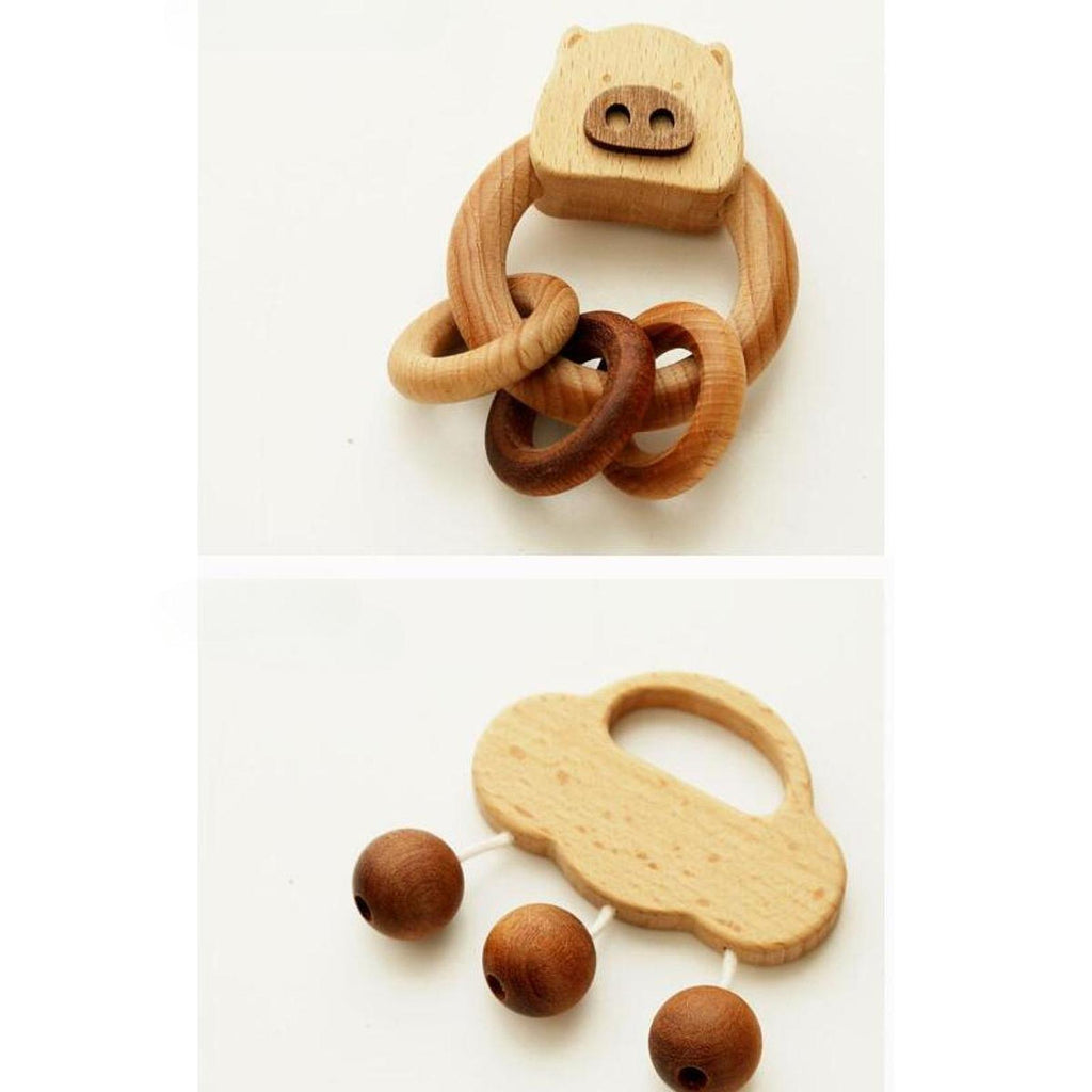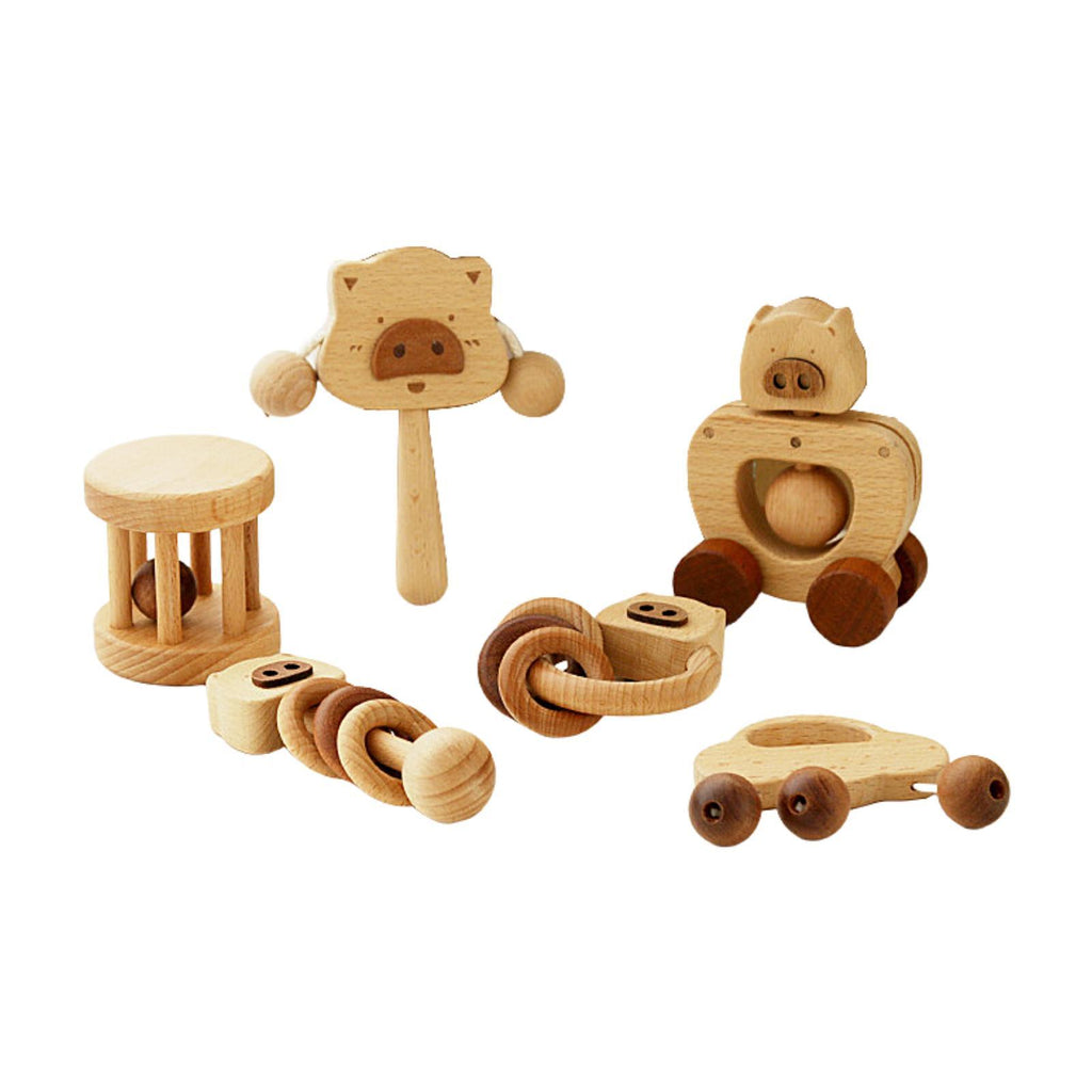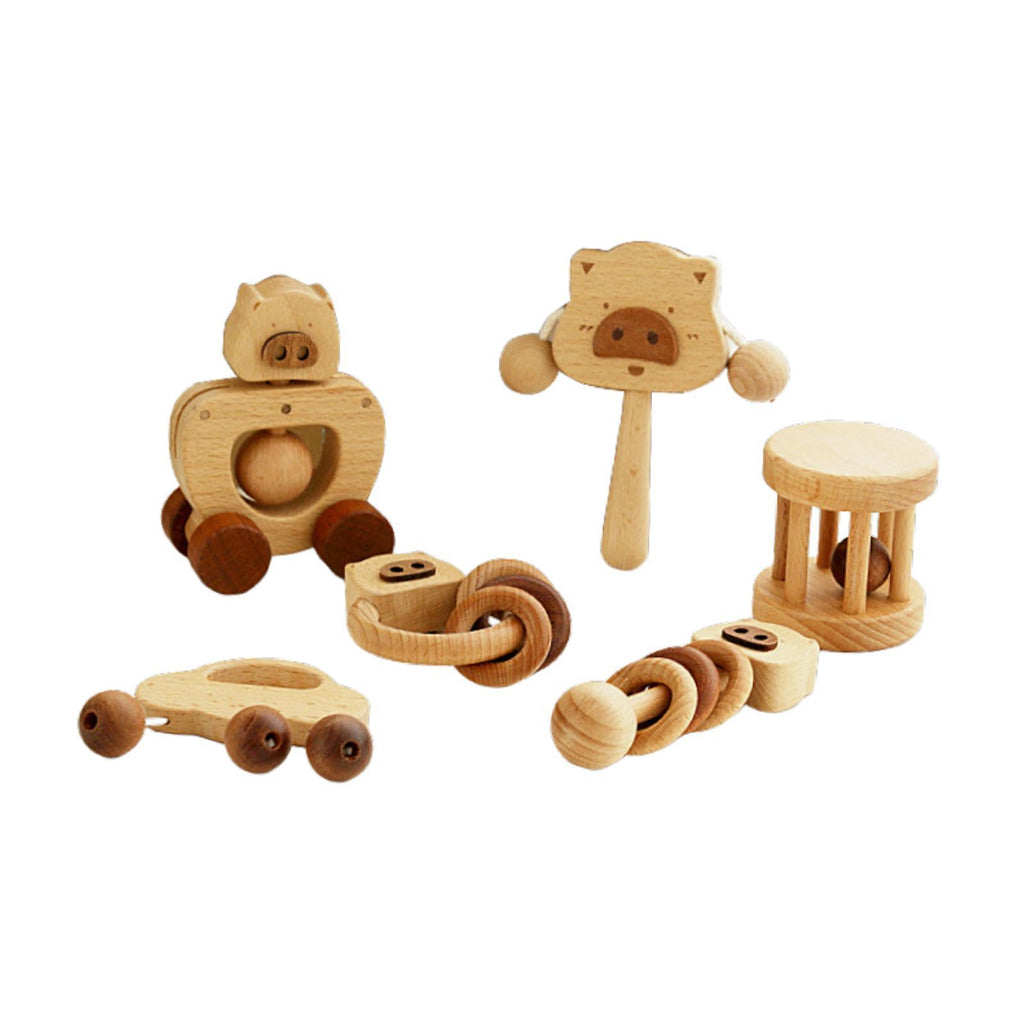【Package】: 6 different shaking instruments, wooden piglet rattle, piglet rocking car, cloud rattle, column rattle, piglet stick rattle, and piglet ring rattle. Adorable shapes that are perfectly sized for small hands