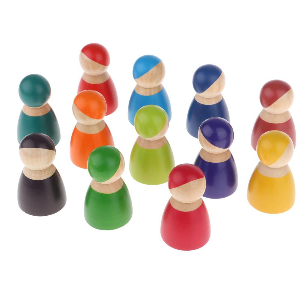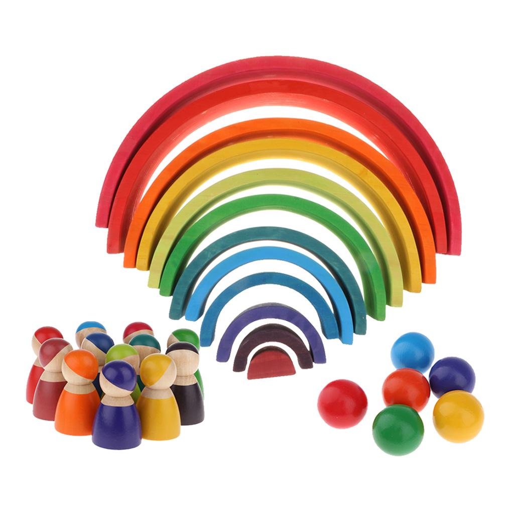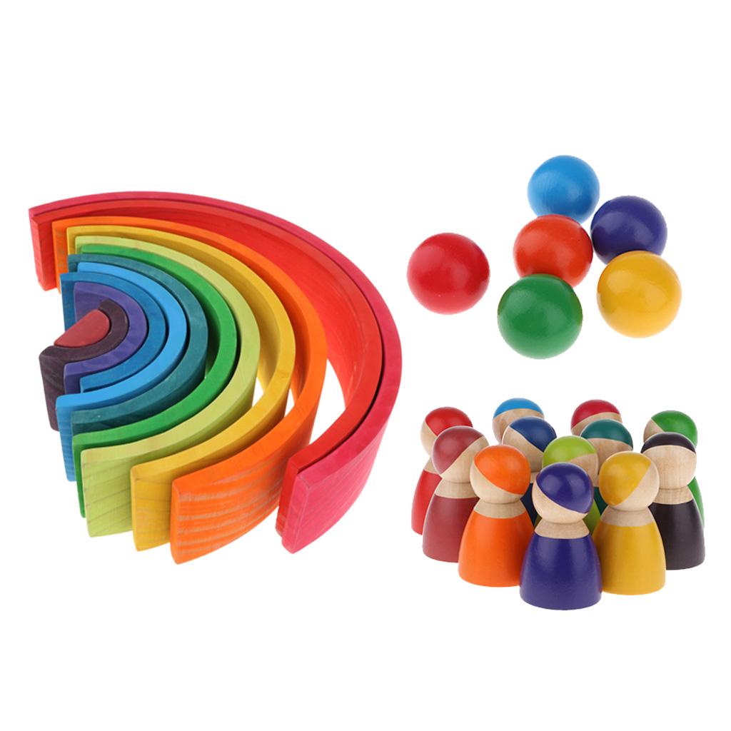 Wooden Rainbow Colour Stacking Rainbow Blocks & Peg Dolls & Rainbow Block Balls Set Kids Children Toy.