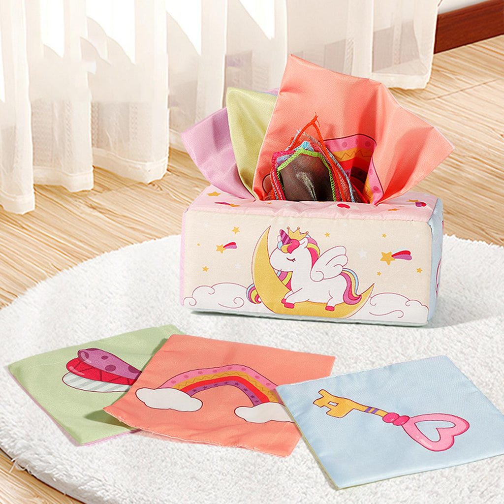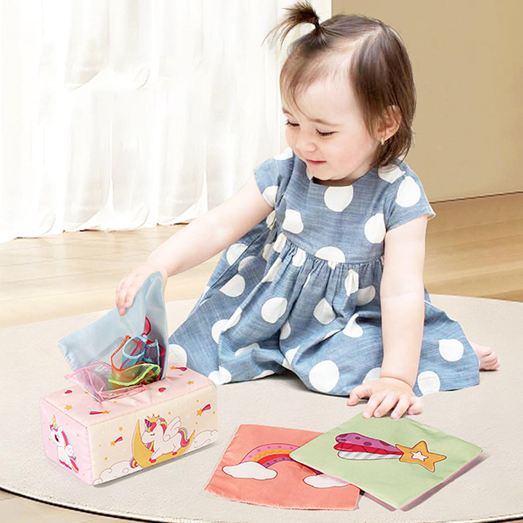 【Infnat Sensory Toy】 Our adorable Tissue Box toy filled with tissues of different colors, patterns and promote the development of fine motor skills for your children.