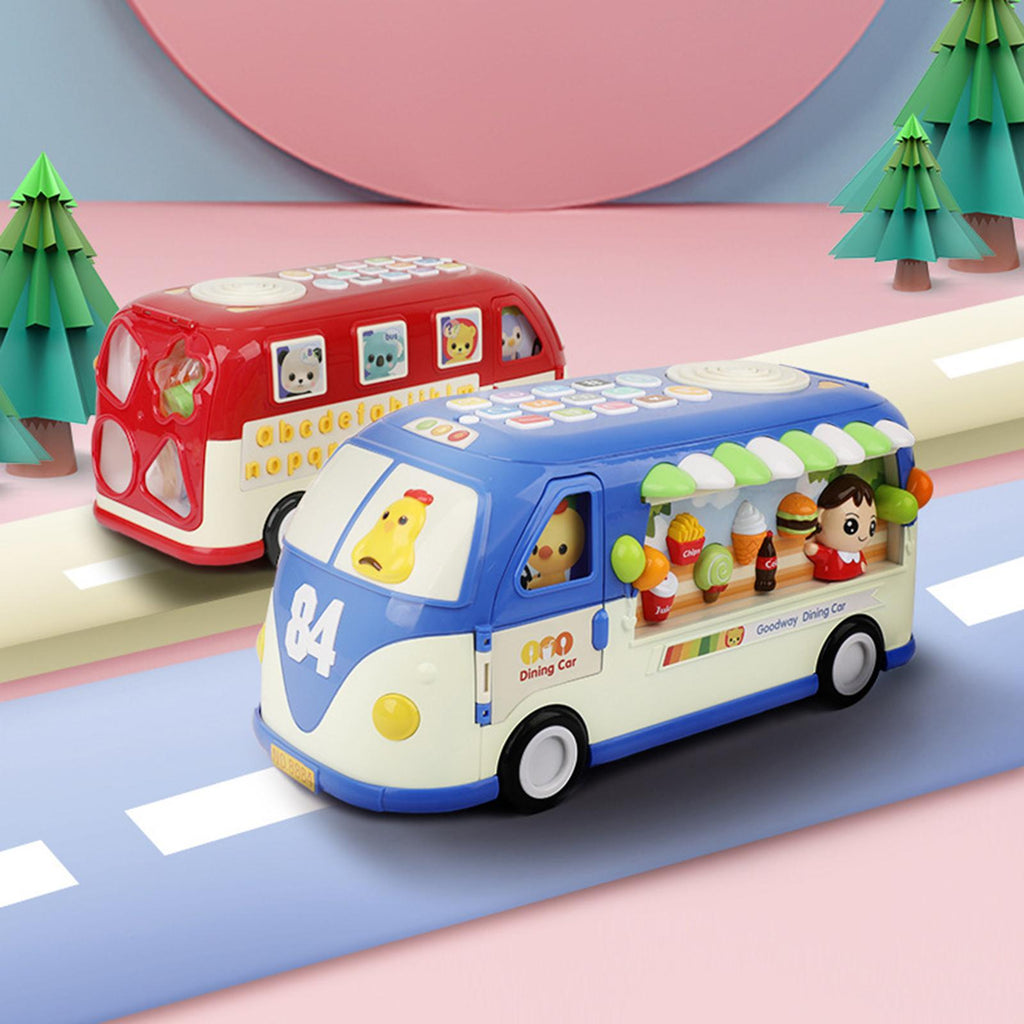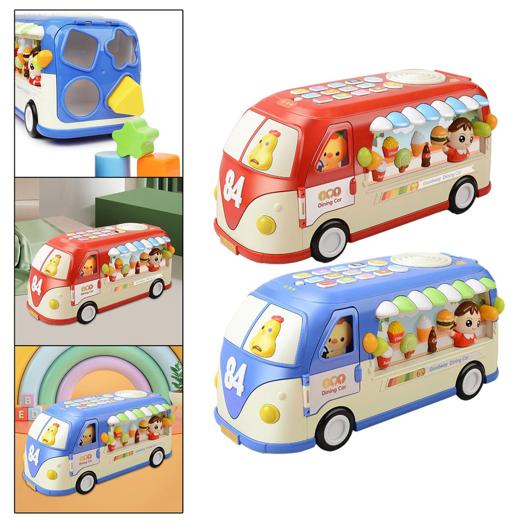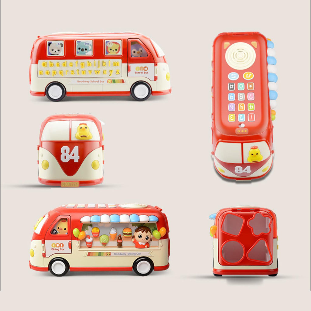 【Multi Ways to Play】: Our music toy bus serves as an excellent early education tool and exploring the many activities, alphabet ABC learning, shape matching, pretend telephone, ice cream shop, color cognition, life motor skills, etc. Colorful designs appeal to kids.