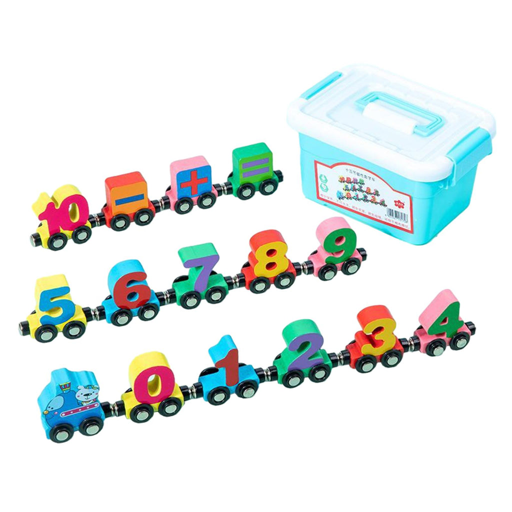 【Wooden Number Train Set】: Wooden train set with bright color consists of number and train head, every train body is individual and connected by magnets. Each train has 4 sliding wheels which glide easily.