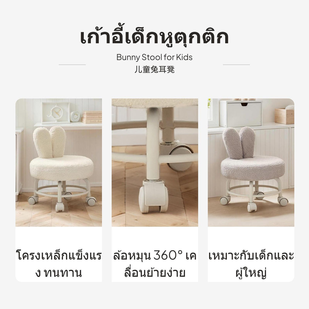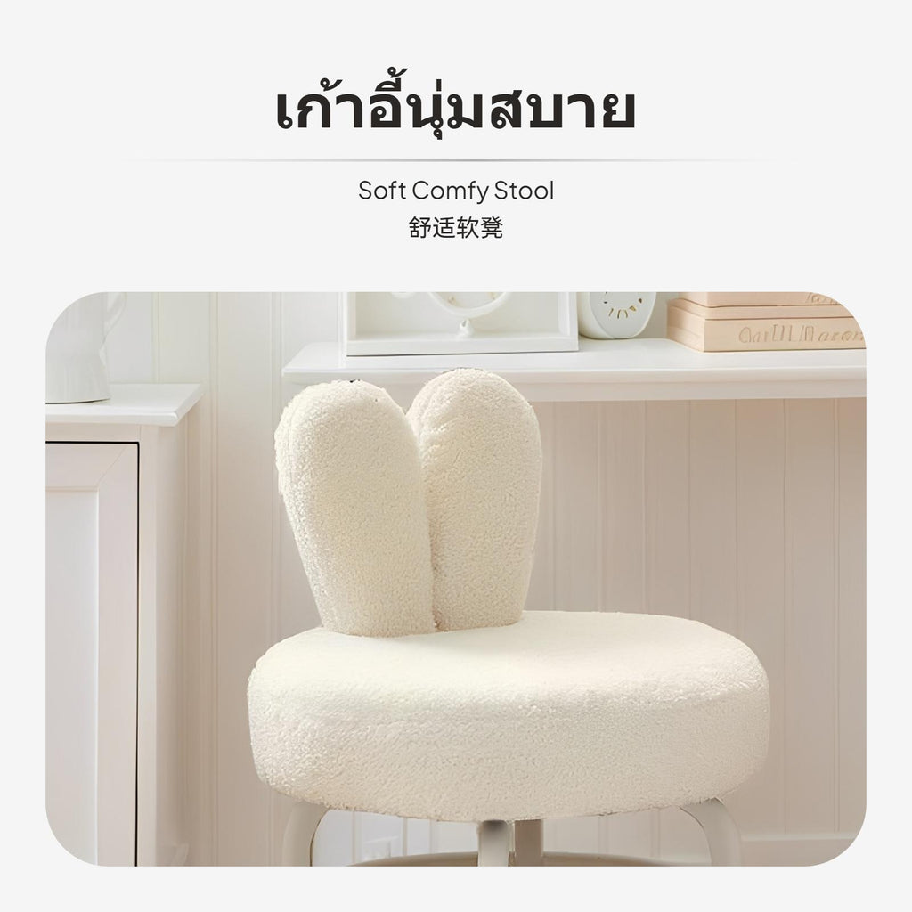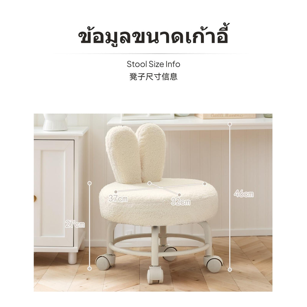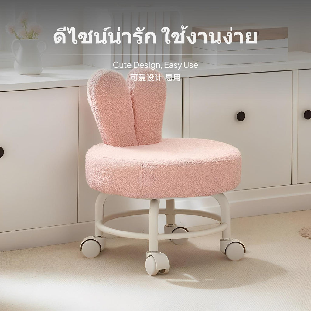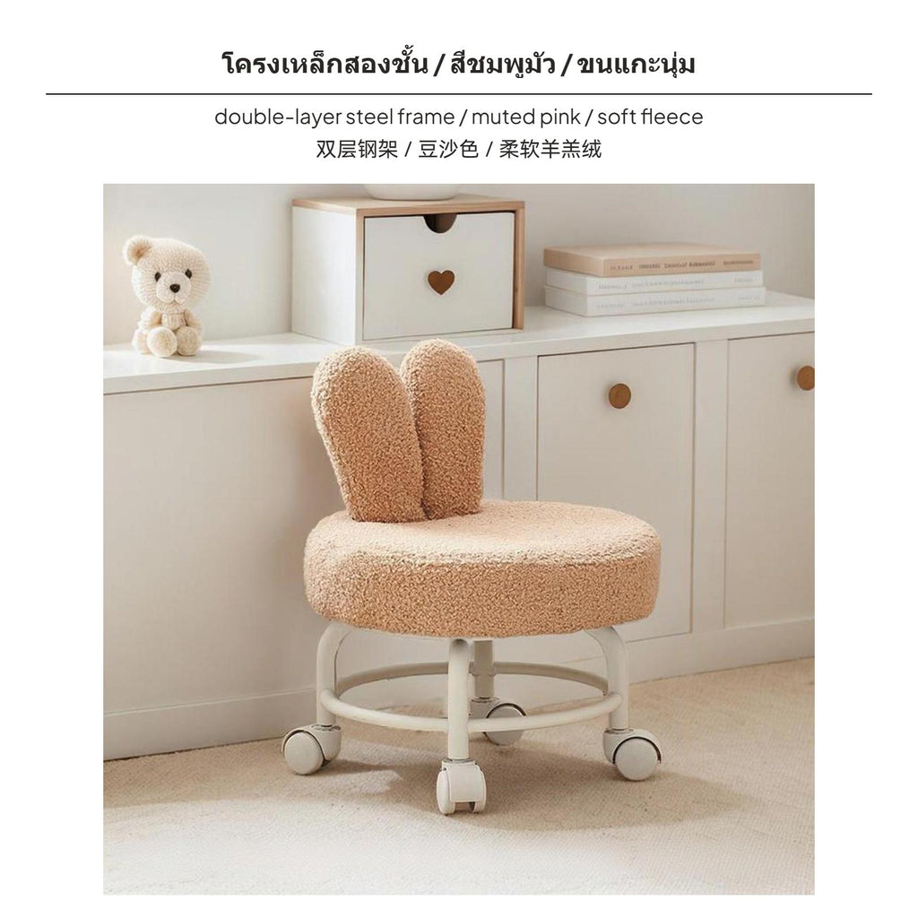 [multi-functional Stool with Cute Design] This rotating rolling stool features a playful hare ear backrest and plush lambswool cover, delivering both aesthetic appeal and practical functionality for children and adults alike.[360° Universal noiseless casters] Equipped with effortless-glidingrolling, noisenoiseless universal casters, it allows effortless-glidingly gliding mobility in living room, entryway, or anywhere at home, perfect for changing shoes, unpacking parcels, or studying.[Ergonomic spine support Support for Comfort] The ergonomic soft ear ear spine supportrest provides gentle spinal support, relieving waist fatigue for prolonged sitting and enhancing comfort for study, play, or relaxation.[High-Resilience seat pad for extended periods Use] Filled with firm support foam and covered with soft lambswool, the widened seat surface ensures comfortable sitting without sinking, perfect for both kids and adults to enjoy for extended periods.[Robust and Stable framework] Choose between low or upgraded high versions with sturdy double steel frame; thickened base ensures safety and stability, making it a dependable choice for families seeking comfort and mobility.