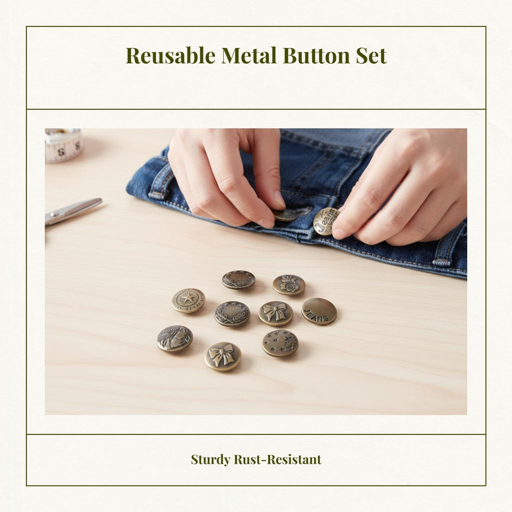 Adjustable Jeans Button for Instant Waist Tightening: Easily modify the waist size of jeans, pants, skirts, and shorts with this removable, no-sew button. Designed for quick DIY clothing adjustments, it provides a tailored fit for various garments.High-Quality Metal Construction: Made from sturdy metal, this button offers long use and dependable performance for common wear. The sturdy material resists bending and preserves its decorative look.Reusable and Removable Design: The detachable button enables repeated use and easy removal, making it perfect for frequent alterations or temporary adjustments without harming your clothes.No Tools or Sewing Required: Install instantly with no tools or sewing needed. Perfect for quick alternatives, cost-effective alterations, and convenient waist size changes at home or while traveling.Versatile Clothing Accessory: suits jeans, pants, skirts, jackets, and more for DIY style projects, decorative enhancement, and practical waist tightening for girls, women, and men.Specification: