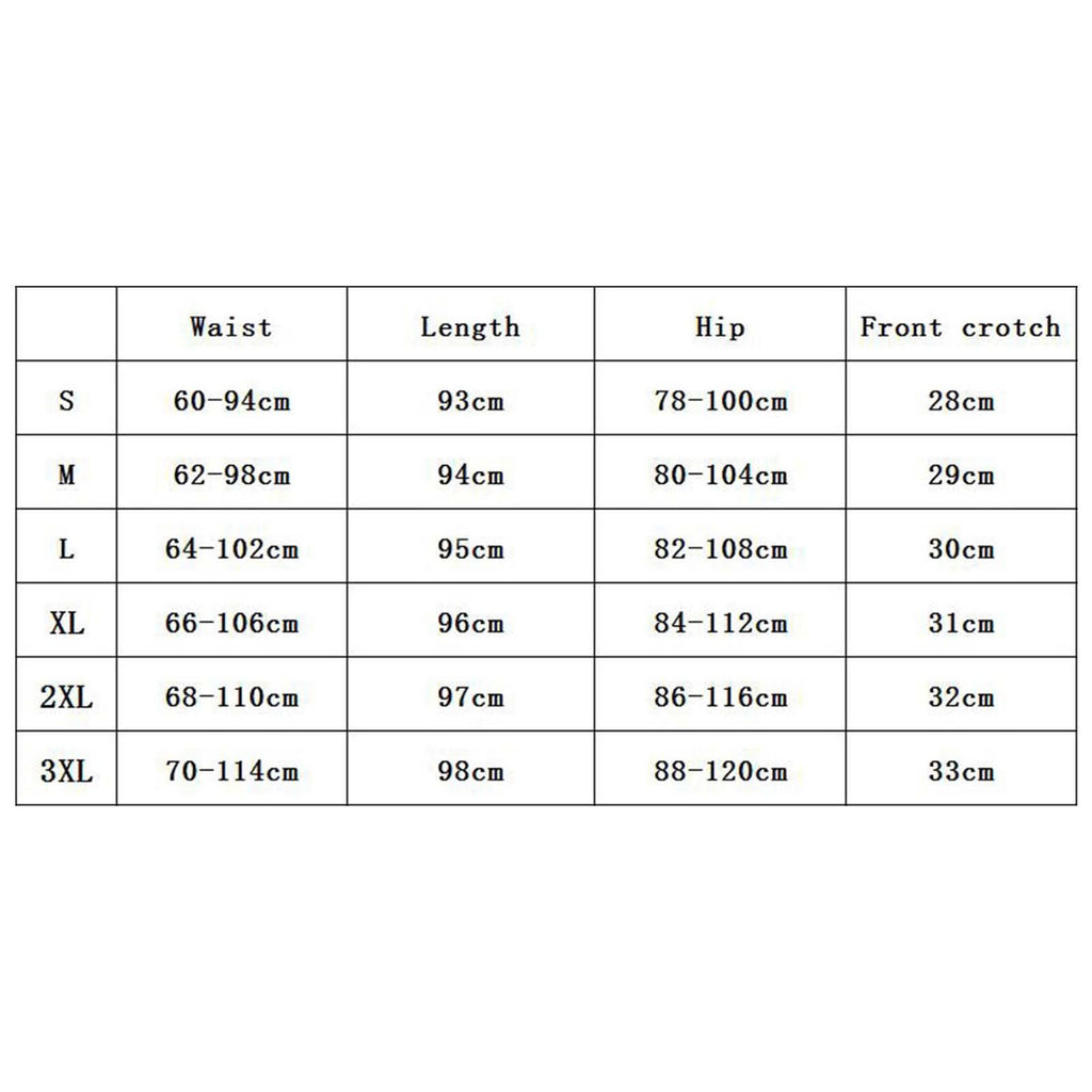 XXXL: Waist 70-114cm/27.56-44.88inch, Length 98cm/38.6 inches, Hip 88-120cm/34.6-47.24inch, Front Crotch 33cm/13inch
