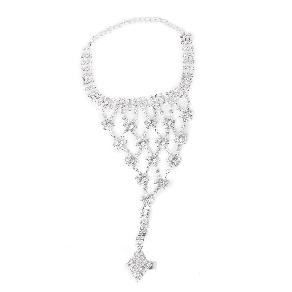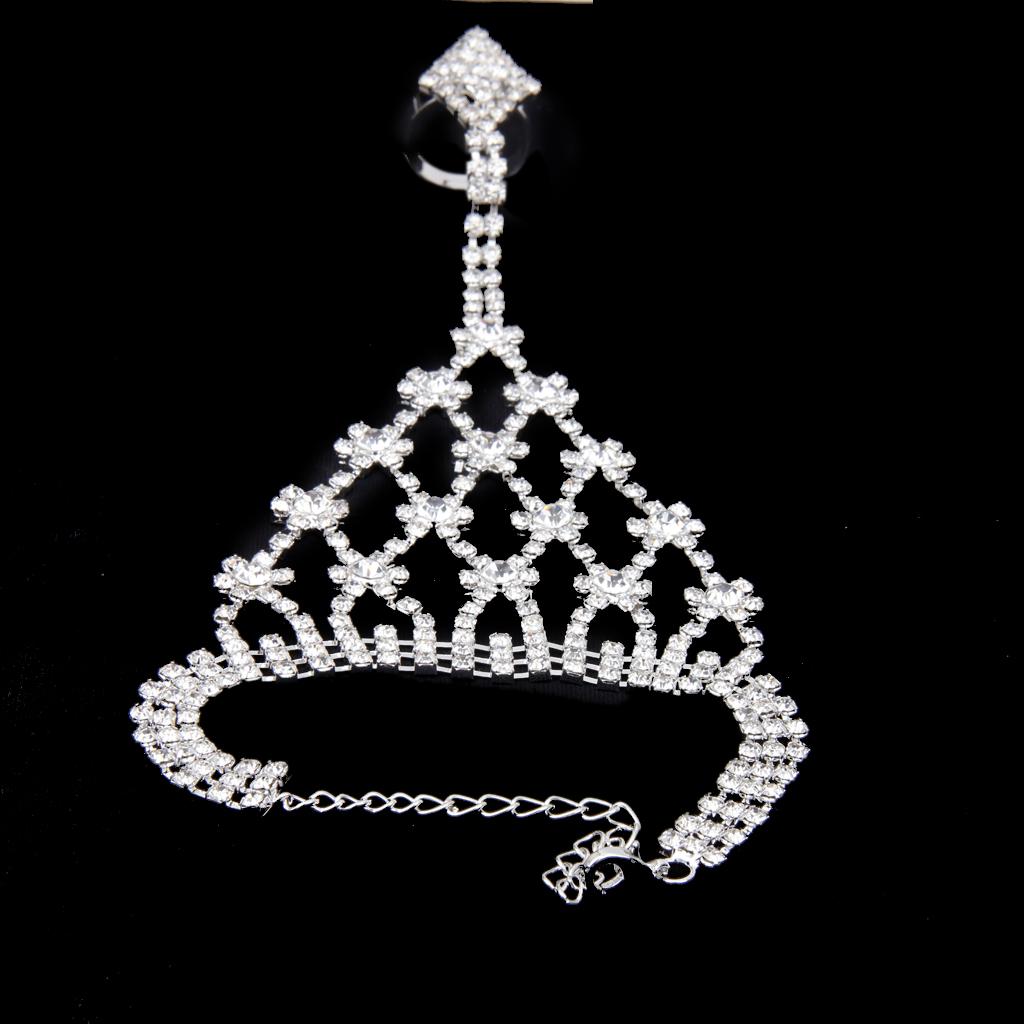 Gorgeous Silver Plated with Circle, Squares and Cross Designs White or Clear Rhinestone Ring Hand and Wrist Slave Bracelet perfect for weddings, clubs, Belly Dancing or any formal event in which you want to make a statement.