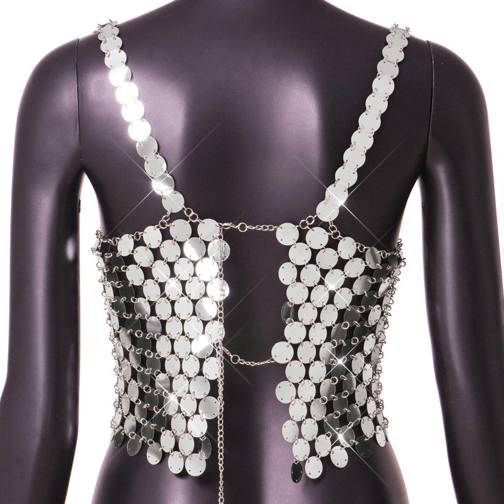 Sequin Tops: Backless sequin vest, sparkly and shiny body chains, fashionable and casual, showing your charming curves.